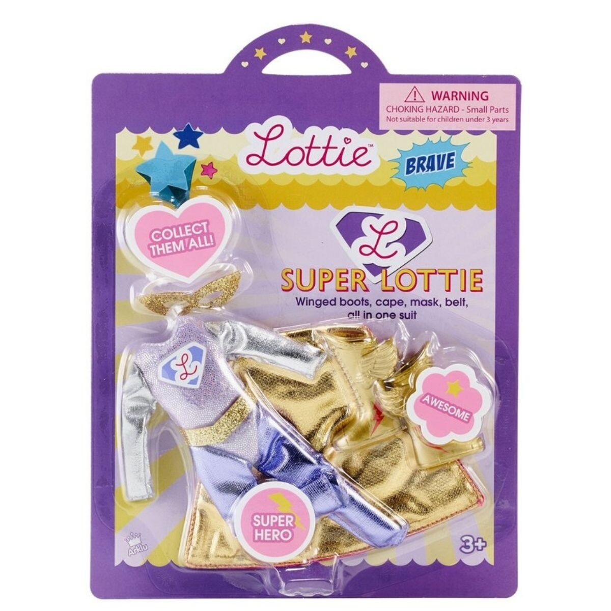 - The Lottie Superhero Outfit Pack includes a superhero mask, a reversible cape, a t-shirt, metallic purple pants, and golden boots.