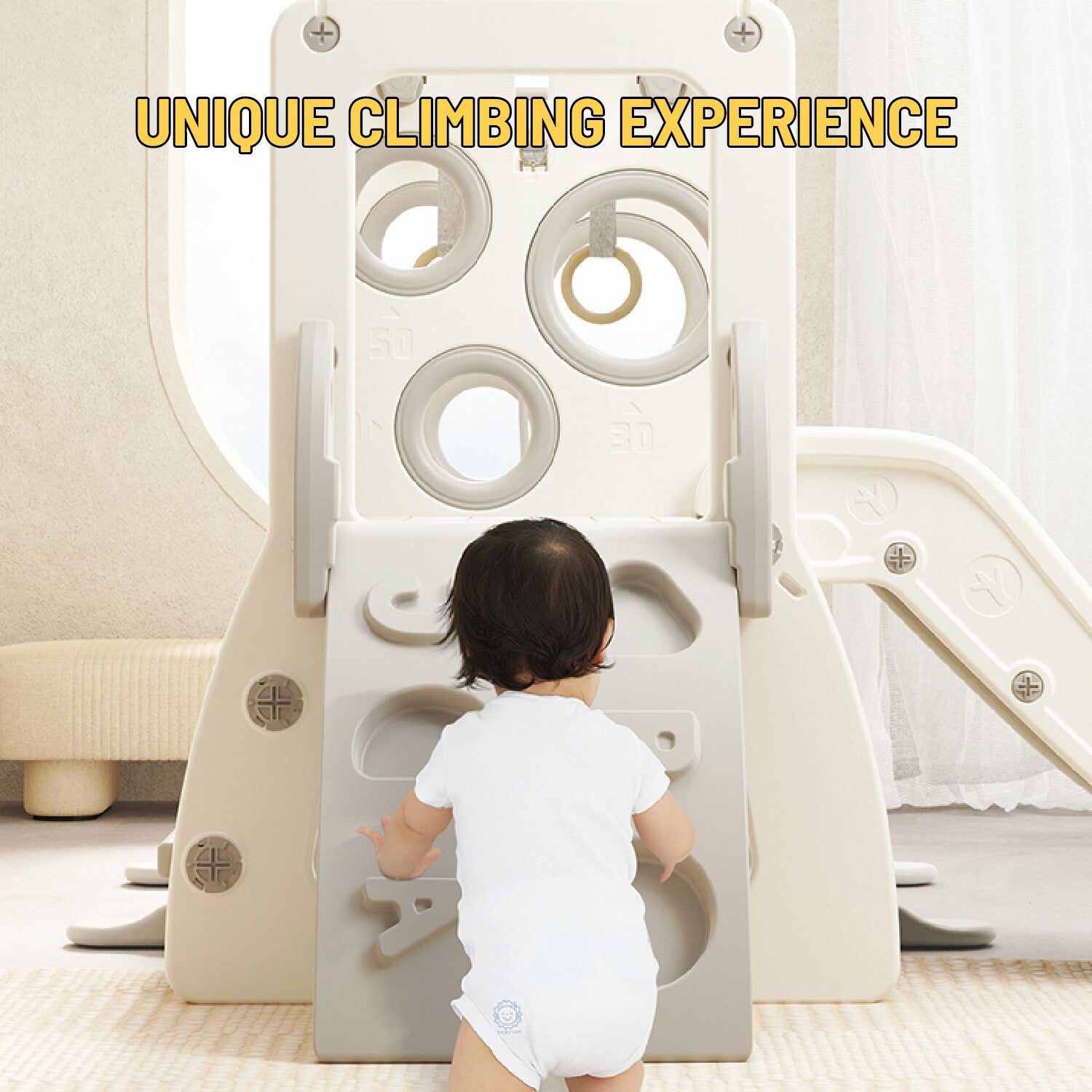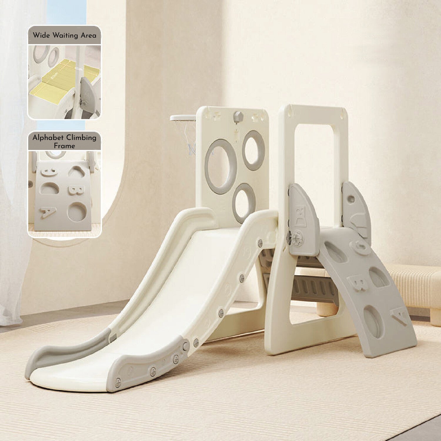This Lovely Baby slide doubles the fun and keeps your little one busy with hours of creative play, encouraging imaginative skills. This fun slide also includes a basket ball hoop & climbing wall to add even more fun for your little one. The sturdy and stable structure gives it a strong load-bearing capacity and allows for an ultimate and fun-packed playing experience made of high-quality and durable material for longevity.