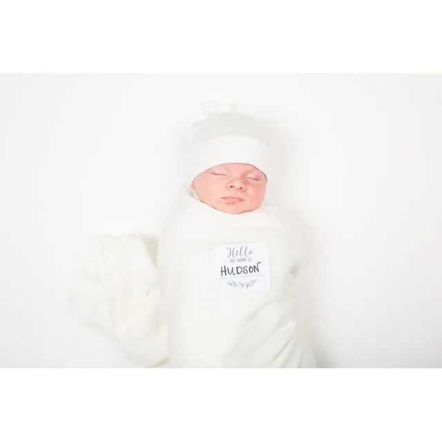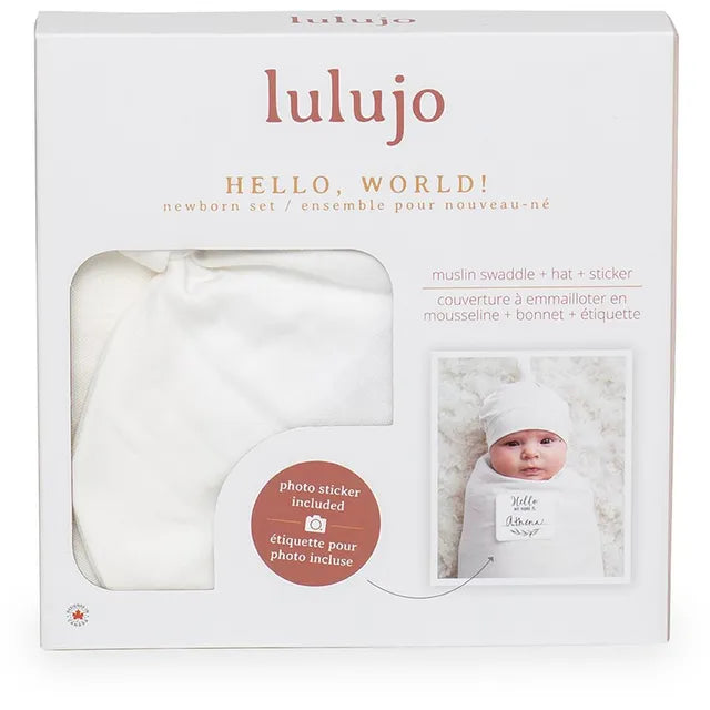 Our Hello World hat and swaddle will have your newborn super cozy and camera ready. This ready-to-use set will make it easy to snap the perfect photo and introduce your little one to family and friends. A special gift for any mom to-be! Each Set includes: silky soft bamboo muslin swaddle, adjustable bamboo jersey knot hat size 0-4 months, HELLO birth announcement sticket