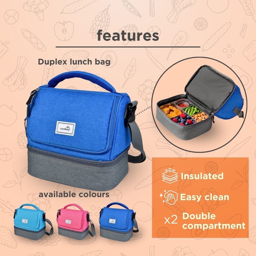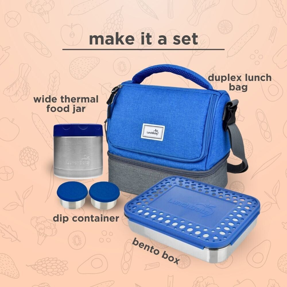 The insulated Duplex Bag keeps your bento boxes as neat as the food inside them. Two separate zippered sections: The bottom is sized perfectly for one LunchBots large container to lie flat. The top holds a Thermal, water bottle, and an apple. Carry by hand or use the extendable shoulder strap.