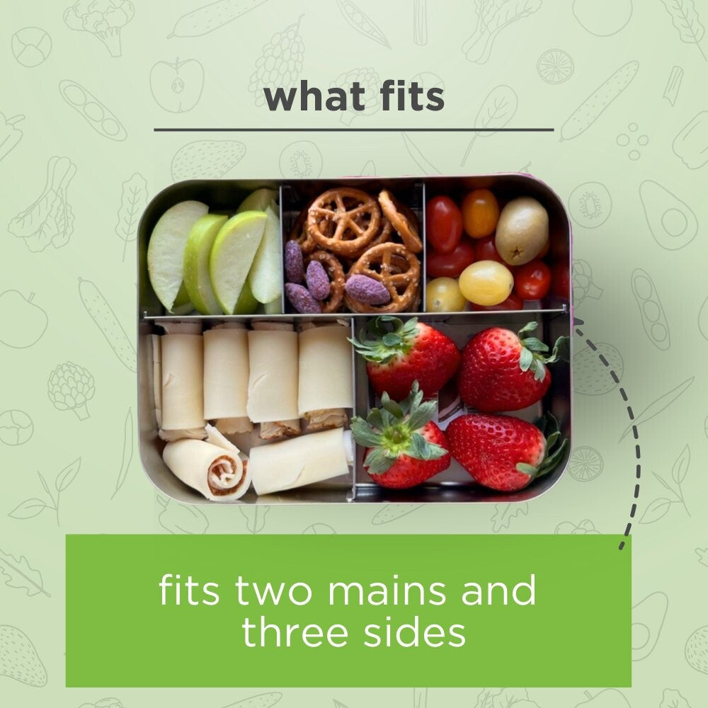This spacious, stainless steel bento box features five compartments, making it easy for you to add variety to your child’s meal. Kids love the Cinco because it keeps food neat and separate without the need for multiple containers.