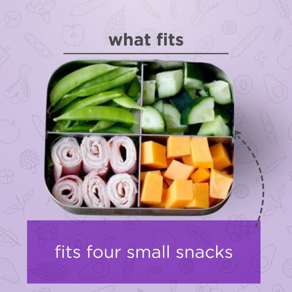 - 4-compartment bento box designed to hold a variety of snack foods.