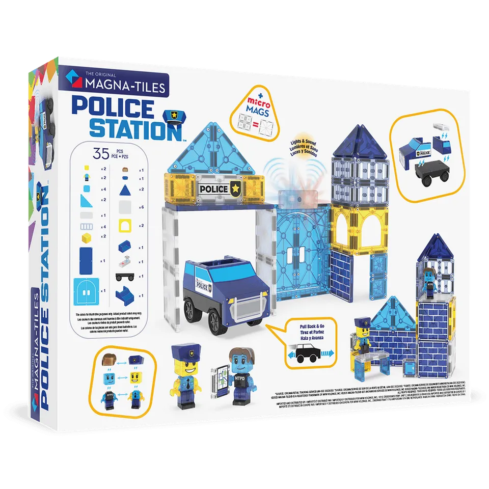 - The MAGNA-TILES Police Station35-Piece Set is uniquely packed with action and imagination, featuring a Pullback Chassis, Light & Sound Tile, and Mix & Match Police Figures for endless heroic adventures and creative play.