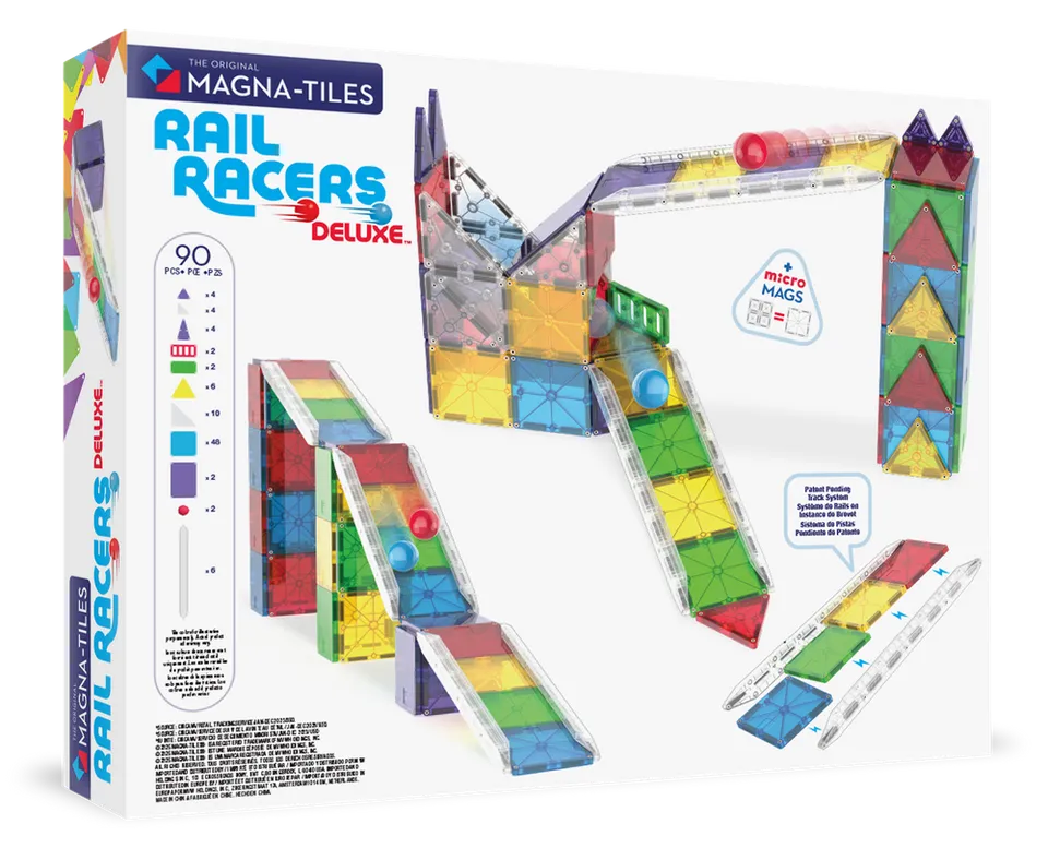 Build, Race, and Roll with the MAGNA-TILES Rail Racers Deluxe 90-Piece Set! The Rail Racers Deluxe 90-Piece Set brings action-packed play and endless creativity to children of all ages. Featuring patent-pending clear Rails and innovative microMAGS pieces, kids can easily design dynamic racetracks, ramps, bridges, and towers for nonstop rolling excitement. Simple to assemble with no prongs or connectors, Rail Racers snap together effortlessly—just four clicks and you’re ready to play! Inspired by a MAGNA-TILES fan and problem-solving dad who wanted a better way to play with his kids, this set combines hands-on fun with frustration-free design. Small Gates and Fences keep builds sturdy, while the included balls add high-speed action. Perfect for exploring speed, momentum, and STEM learning, Rail Racers empower kids to create with confidence. And when playtime ends, everything stores neatly, keeping the fun ready to roll for next time!