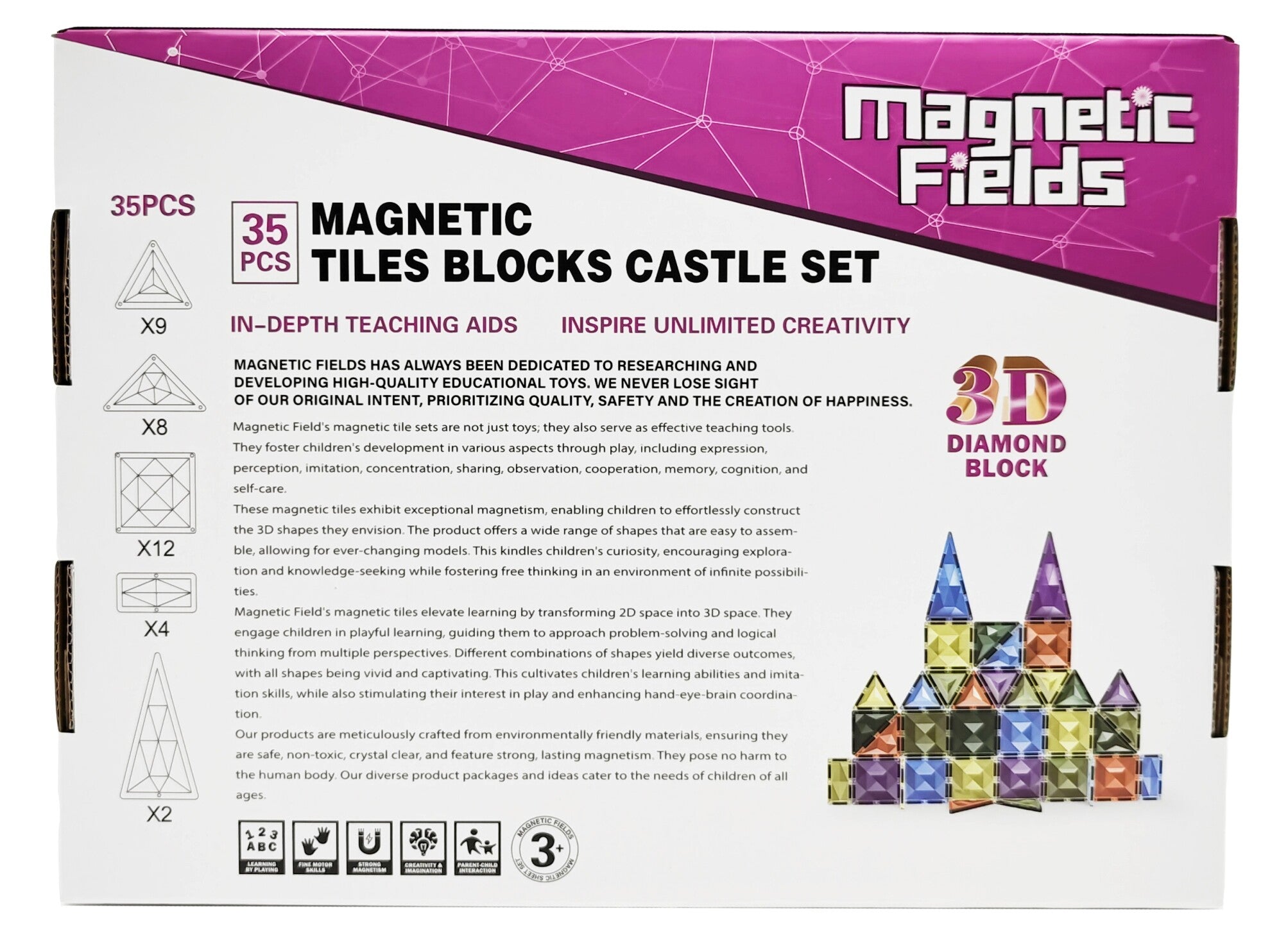 Magnetic Fields Magnetic Tiles Blocks Castle Set - 35 Pcs offers endless creative possibilities for young builders and explorers. With 35 colorful, durable magnetic tiles, this set lets children easily construct castles, structures, and imaginative designs, promoting creativity and problem-solving skills. Perfect for enhancing spatial awareness and fine motor skills, this set provides a fun, interactive way to learn and play. Designed for kids aged 3 and up, it encourages independent or collaborative play, making it an ideal gift for fostering STEM development and sparking endless hours of imaginative fun.