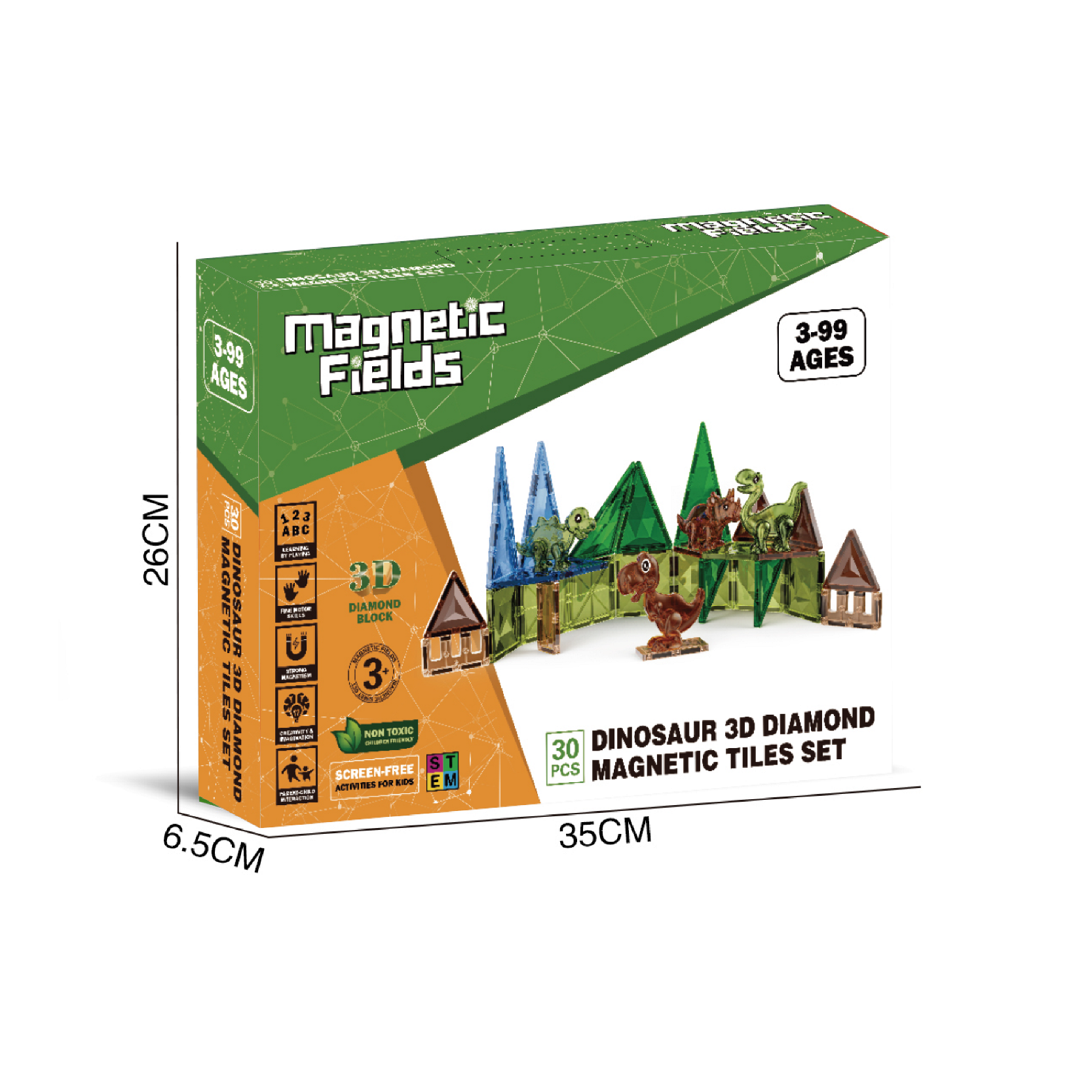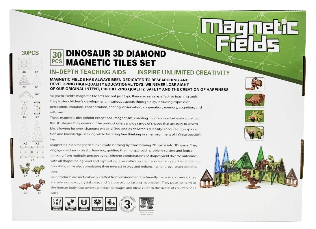 Magnetic Fields Dinosaur 3D Diamond Magnetic Tiles Set - 30 Pcs is a fun and educational building set that allows children to create exciting 3D dinosaur shapes and structures. With 30 vibrant, diamond-shaped magnetic tiles, this set sparks creativity and imagination, while promoting STEM learning through hands-on play. Ideal for children aged 3 and up, it helps develop fine motor skills, spatial awareness, and problem-solving abilities. Whether building solo or with friends, this set provides endless possibilities for building, learning, and having fun while exploring the world of dinosaurs and construction.