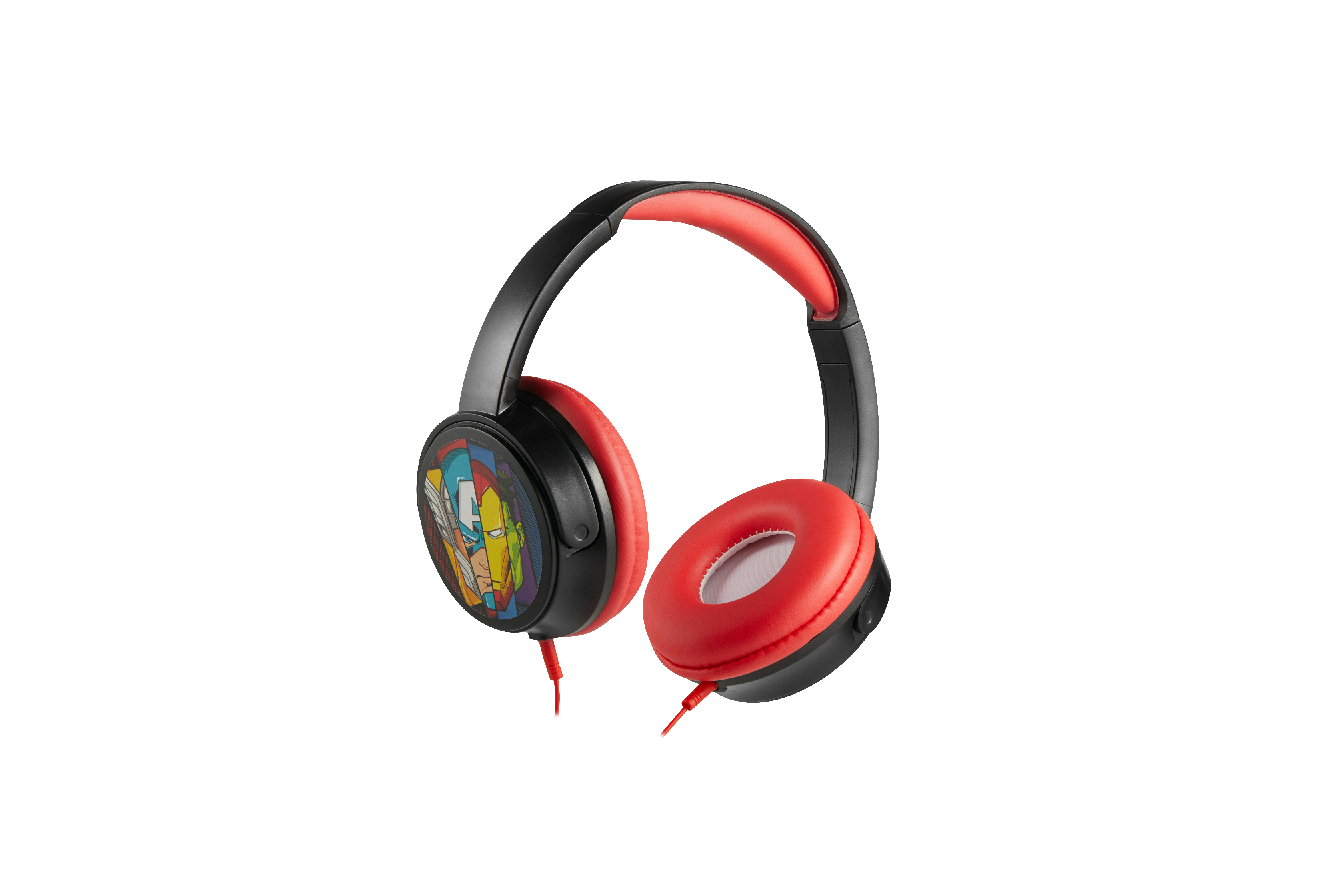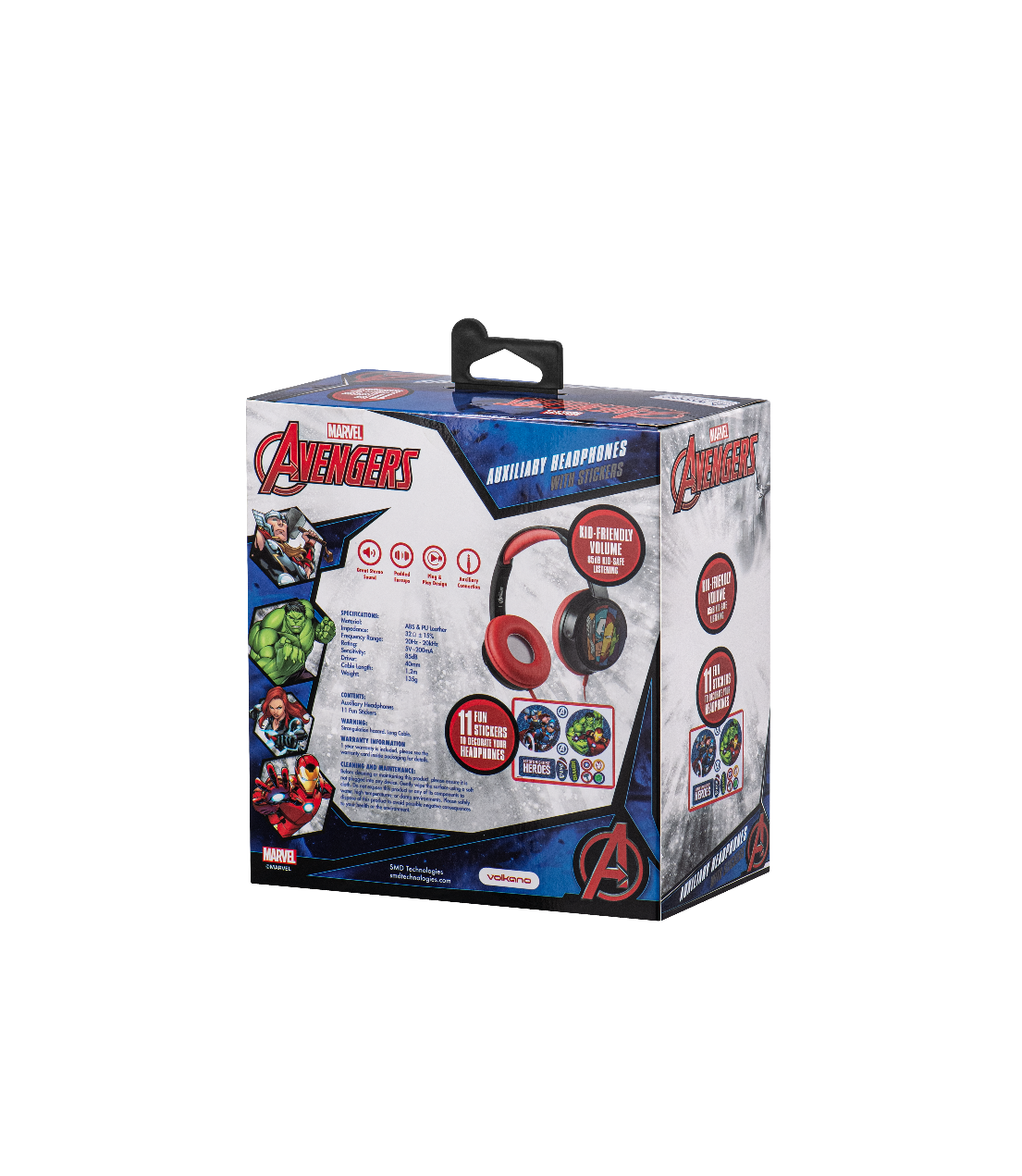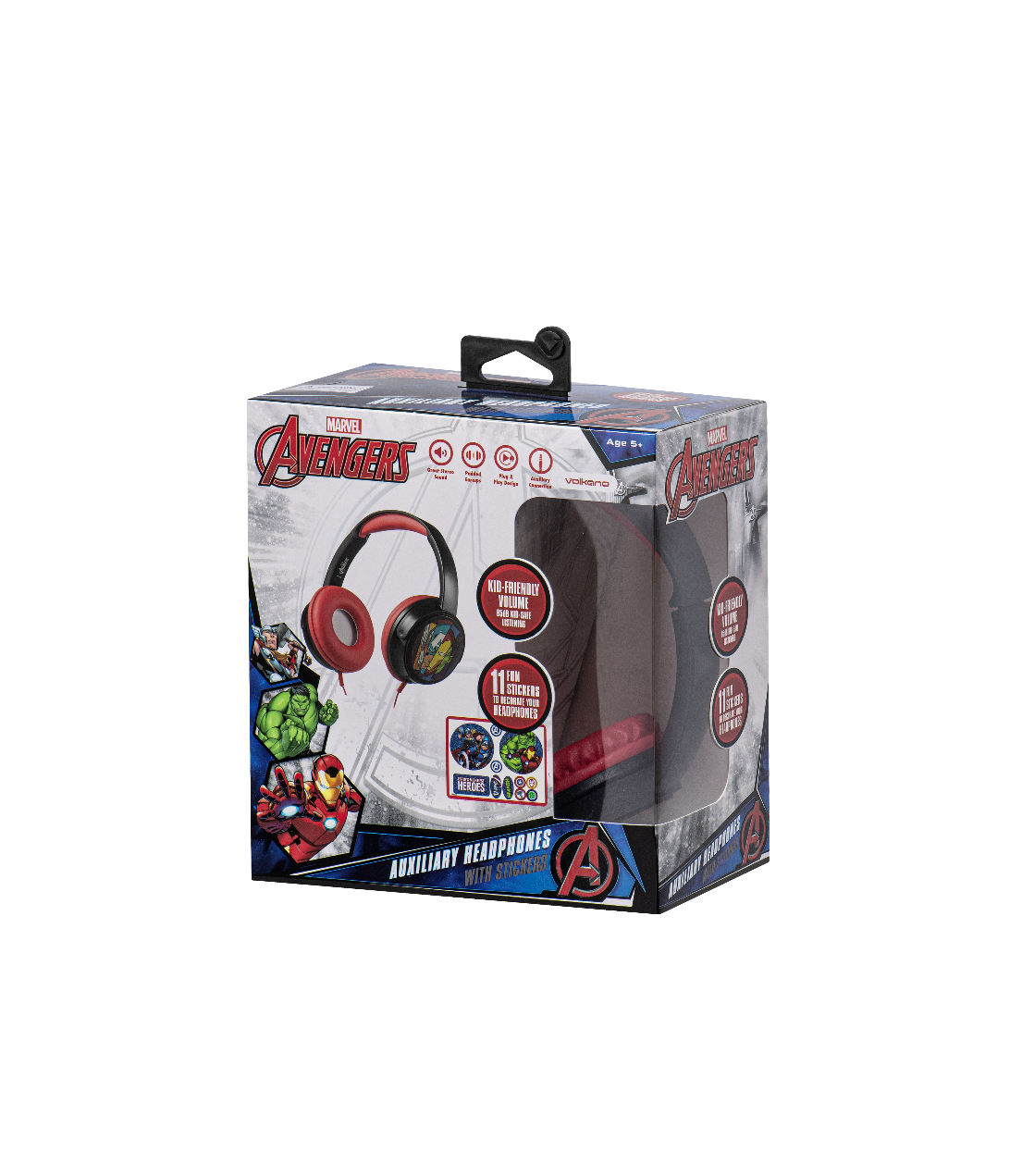 Assemble the ultimate listening experience with the Marvel Avengers AUX Headphones! These headphones are perfect for young heroes featuring padded earcups for comfort and an easy plug & play design with an AUX connection. With great stereo sound, your child can enjoy their favorite Avengers themes and shows like never before. The set includes 11 fun stickers featuring iconic Avengers like Iron Man, Captain America, and the Hulk allowing your child to personalize their headphones and feel like a true Avenger.