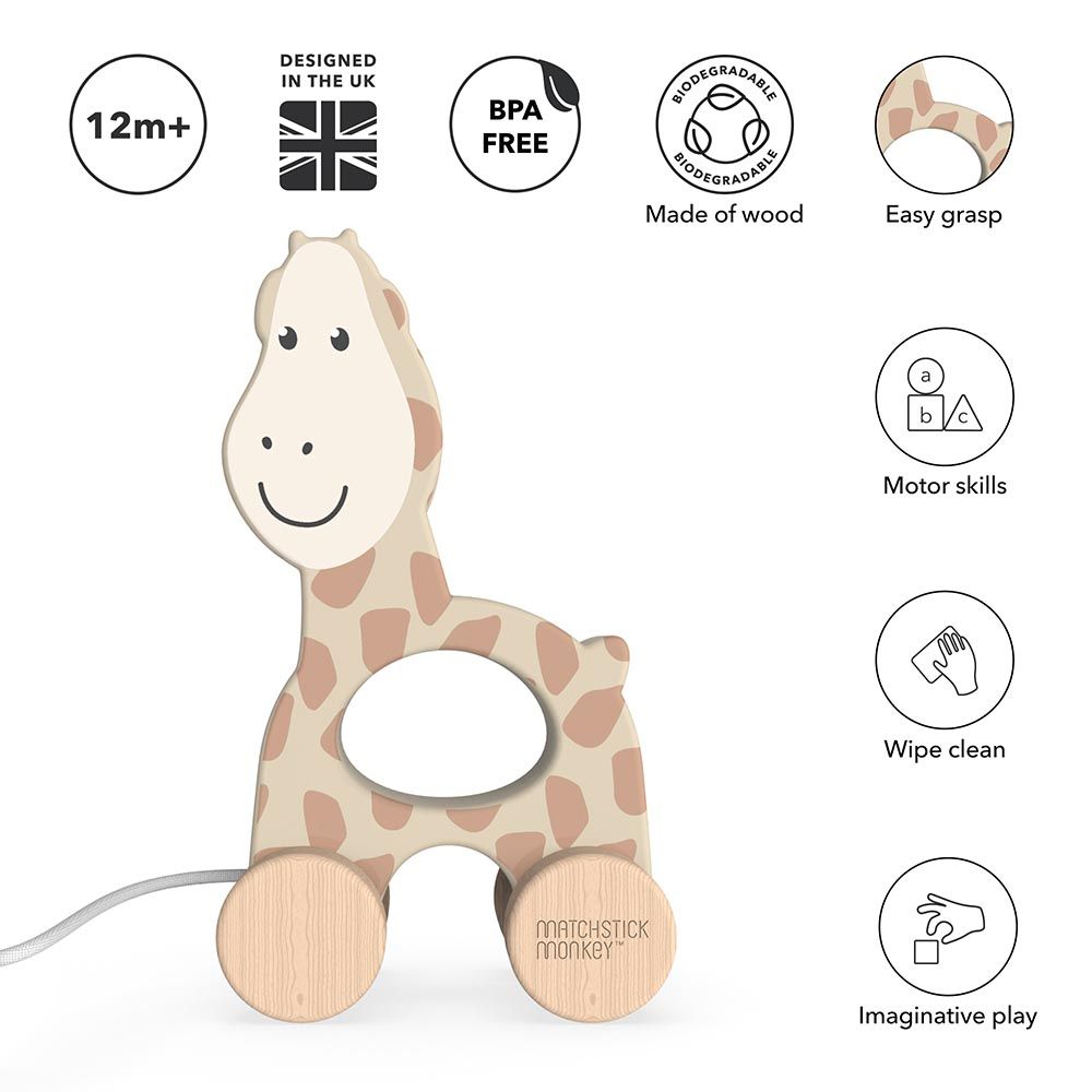 The Matchstick Monkey Pull Along Animal Toy is the perfect way to encourage imaginative and creative play. Made from Beechwood with a cotton string, this wooden pull along is easy to grip and hold with the cut out middle design. A great gift for a child's first birthday, as they have endless fun racing or pushing it around the floor. Suitable for 12 months plus.