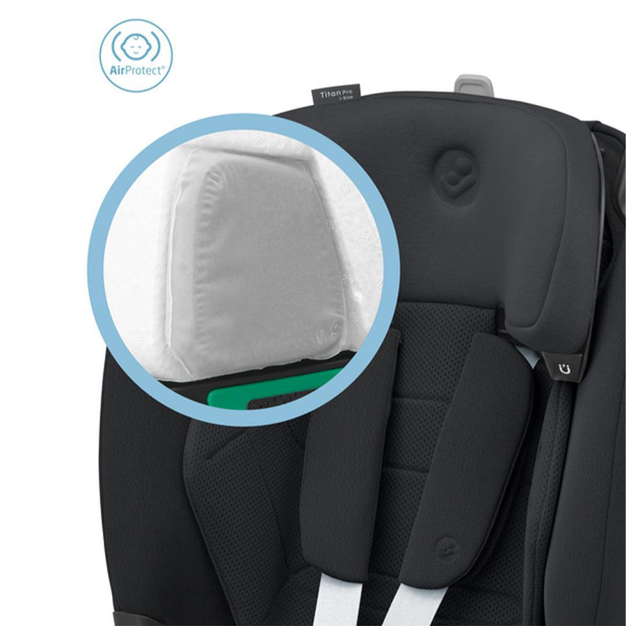 - Titan Pro i-Size features patented Air Protect safety cushions in the headrest, which reduce the risk of head injury by up to 20% and enhances the comfort for your child.