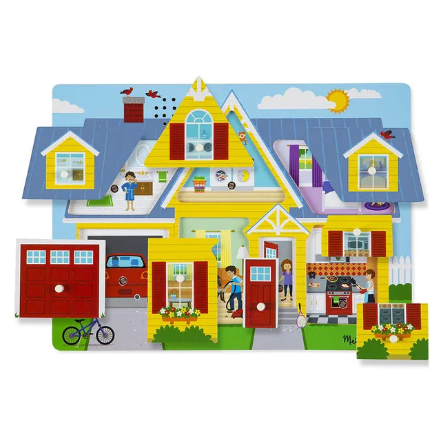 This interactive wooden peg puzzle features eight different household objects, each producing its unique sound when the piece is correctly placed in the puzzle board. Children will delight in hearing the sounds of a telephone, doorbell, alarm clock, and more. This puzzle is designed to enhance auditory processing, fine motor skills, and problem-solving abilities, while also teaching object recognition.