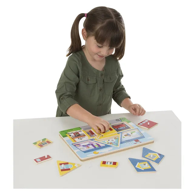 - Eight brightly colored wooden household object pieces with easy-to-grasp pegs.