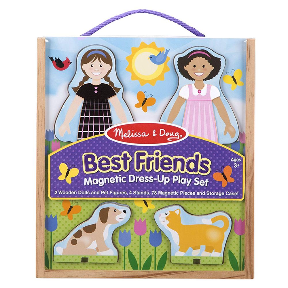 Create endless stylish looks and imaginative stories with the Melissa & Doug Best Friends Magnetic Dress Up Play Set! This delightful wooden play set features two magnetic wooden doll figures and over 50 magnetic clothing pieces and accessories. Children can mix and match outfits to dress their "best friends" for any occasion, fostering fine motor skills, creative expression, and imaginative play. The sturdy wooden storage tray keeps all pieces organized for easy cleanup and on-the-go fun.