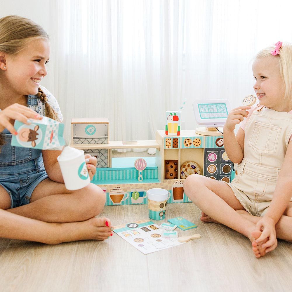 - 20-piece set: Includes a wooden coffee shop counter, a coffee machine, a cup, a milk carton, a sugar packet, a coffee pod, a wooden spoon, a double-sided menu card, and various wooden food items like a donut, cookie, and muffin.