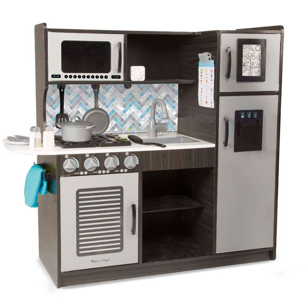 The Melissa & Doug Chef's Kitchen - Charcoal is a beautifully designed, modern play kitchen that inspires imaginative culinary adventures for children aged 3 and up. This sturdy wooden kitchen features a sleek "charcoal" grey finish with realistic details, including a refrigerator, freezer, oven, stovetop, microwave, and sink. With working doors, knobs that turn, and ample storage, it provides a complete and engaging environment for little chefs to cook, bake, and create delicious pretend meals.