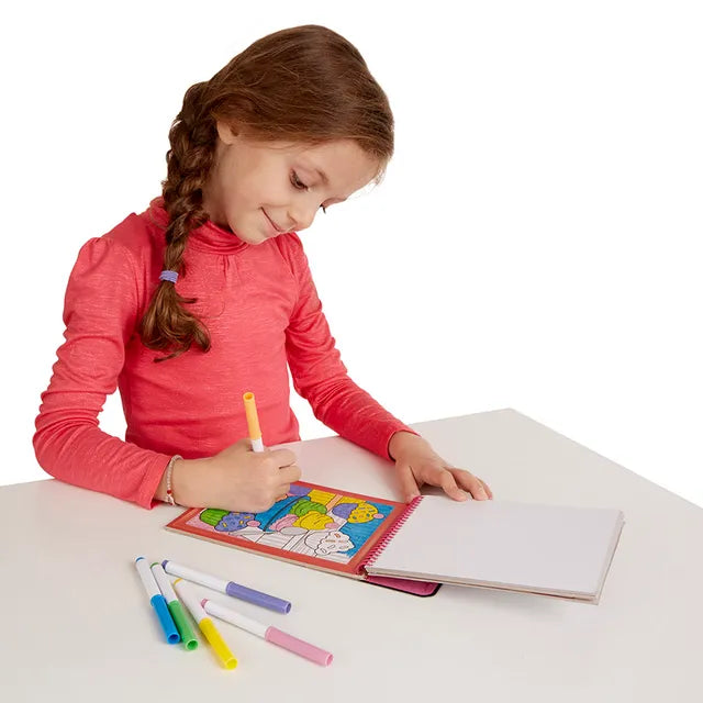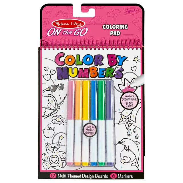 The Melissa & Doug Color By Numbers - Pink MD5377 is a fun and mess-free activity book perfect for young artists on the go. This travel-friendly art set includes 12 sturdy picture boards with number-coded pictures, and all the felt-tip markers needed to complete each one. The numbers disappear as you color, revealing vibrant images. The markers store conveniently in the cover, making it an all-in-one arts-and-crafts activity that's great for travel or anytime. It promotes color recognition, fine motor skills, and matching.