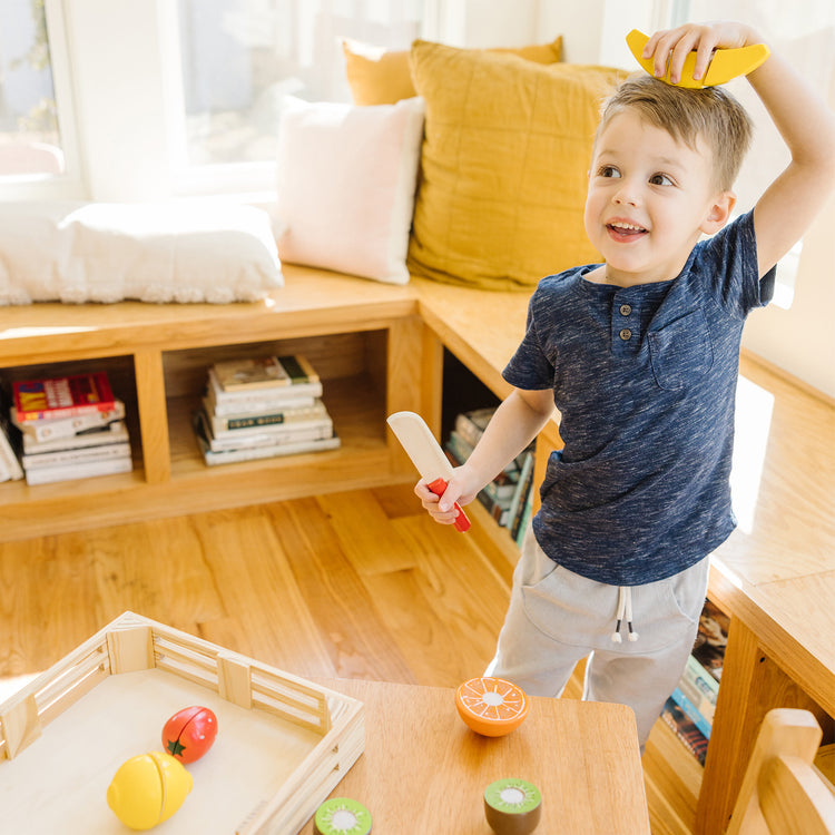 - Seven pieces of wooden fruit with self-stick tabs for easy "slicing" and rejoining: