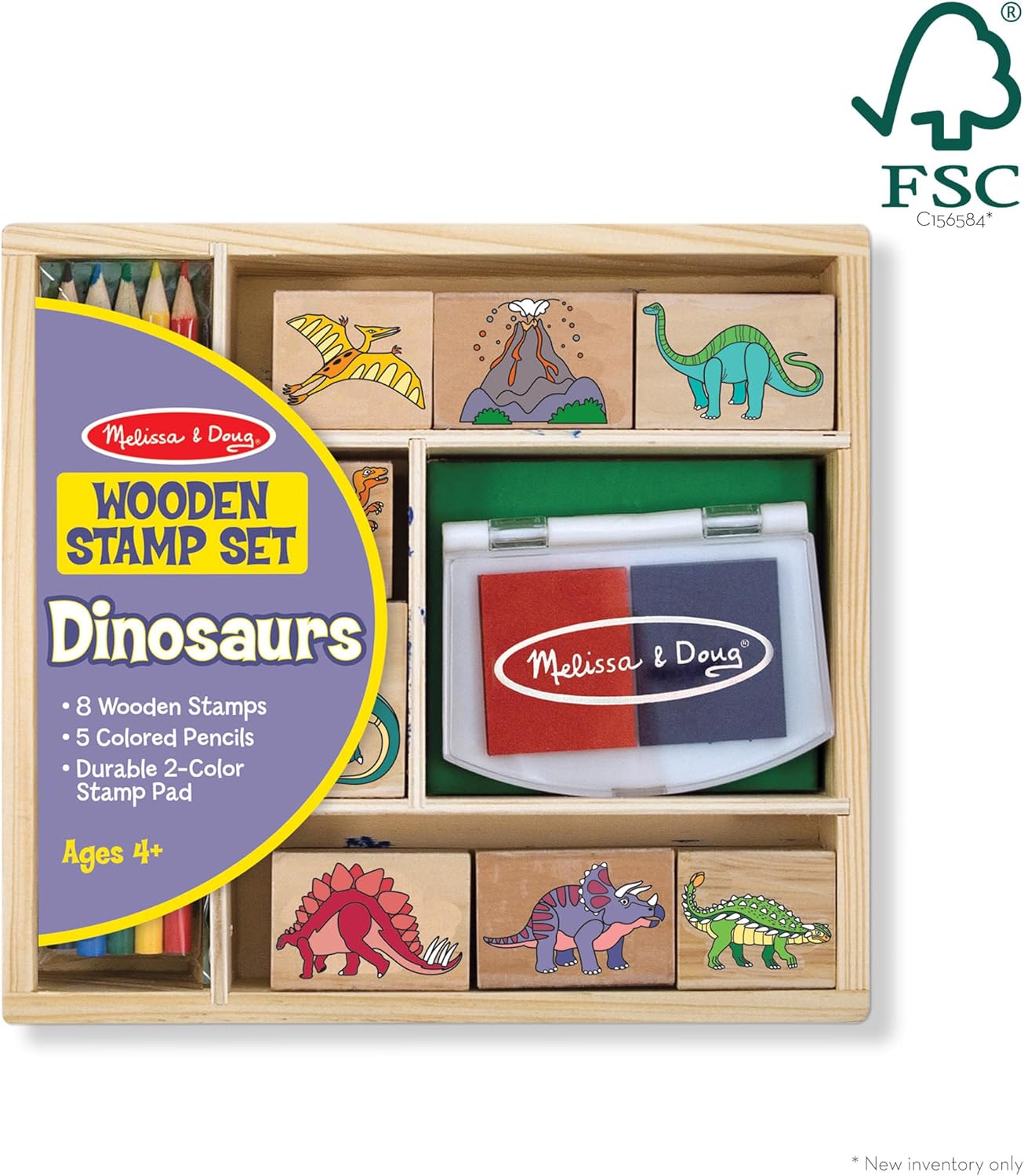 - Variety of Dinosaur Stamps: Includes multiple detailed wooden stamps featuring different dinosaur species and prehistoric elements like a volcano.