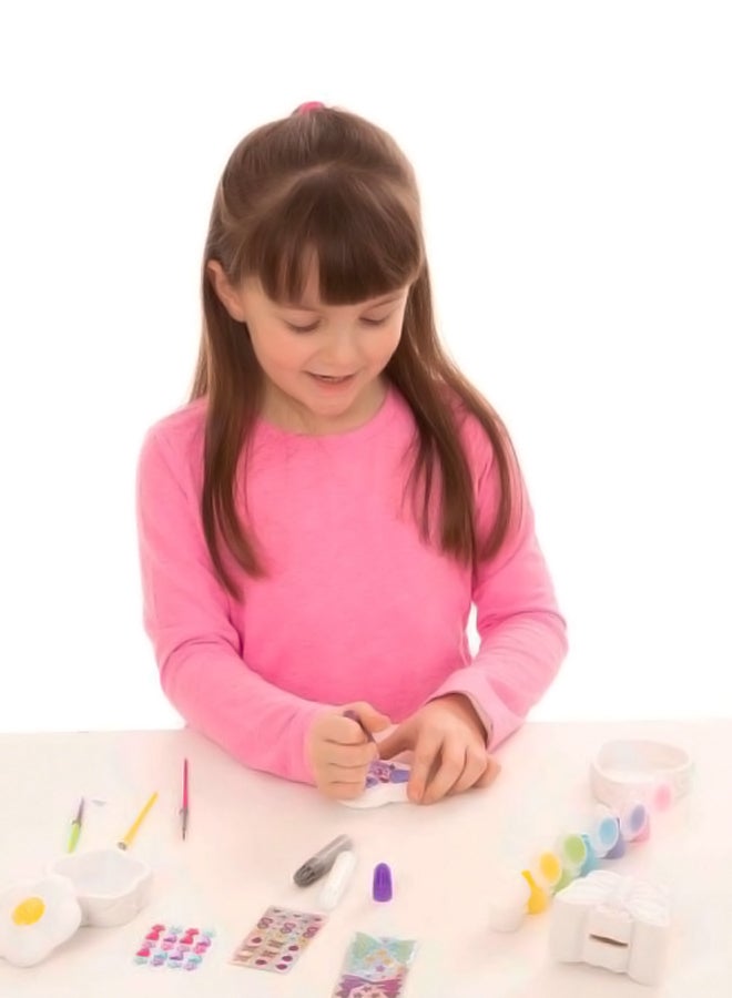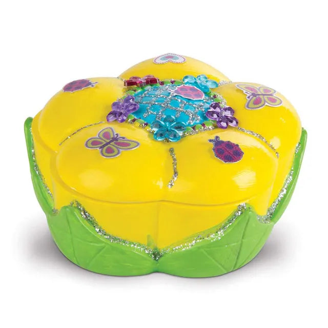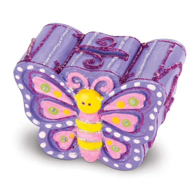 The Melissa & Doug Created by Me! Favorite Things Craft Kit (MD9534) is an engaging set that allows children to decorate three "kid-favorite" items: two resin treasure boxes with detailed flower and heart designs, and a resin butterfly bank featuring cheerful patterns. This all-inclusive kit provides everything needed for creative expression, including gem stickers, foil stickers, six pots of paint, three paintbrushes, two glitter glues, and white glue. It's a perfect activity for parties or rainy days, promoting fine motor skills, hand-eye coordination, and creative expression as kids personalize their favorite things. The butterfly bank also stands upright and has a coin slot on top.