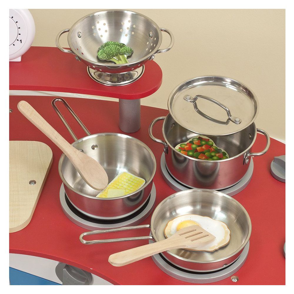 The Melissa & Doug Let's Play House - Pots & Pans Set is a delightful and realistic kitchen accessory designed for children aged 3 and up who love imaginative cooking play. This eight-piece set includes a colander, pot with lid, 2 pans, and 2 utensils (spatula and spoon), all made from shining stainless steel. It's perfectly sized for little chefs and encourages creative role-playing, fine motor skills, and a love for cooking.