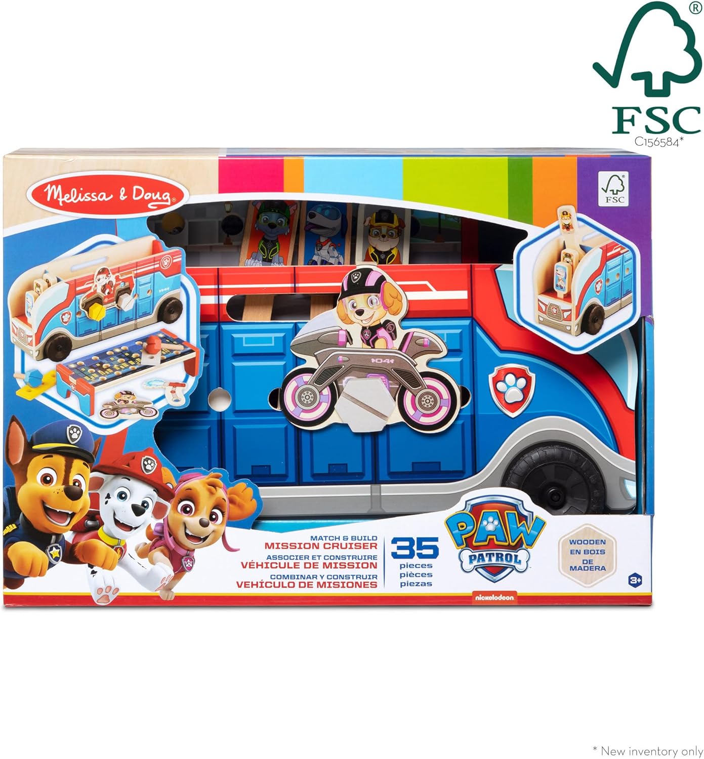 Get ready for ultimate rescue missions with the Melissa & Doug PAW Patrol 2 Match & Build Mission Cruiser! This exciting wooden play set combines a sturdy wooden Mission Cruiser vehicle with two wooden pup figures (Chase and Ryder) and a set of 10 double-sided wooden puzzle pieces. Children can match the puzzle pieces to complete various mission scenarios on the Cruiser's interior, then deploy Chase and Ryder for imaginative rescue adventures. This engaging toy fosters fine motor skills, problem-solving, and creative storytelling, all while bringing the beloved PAW Patrol world to life.