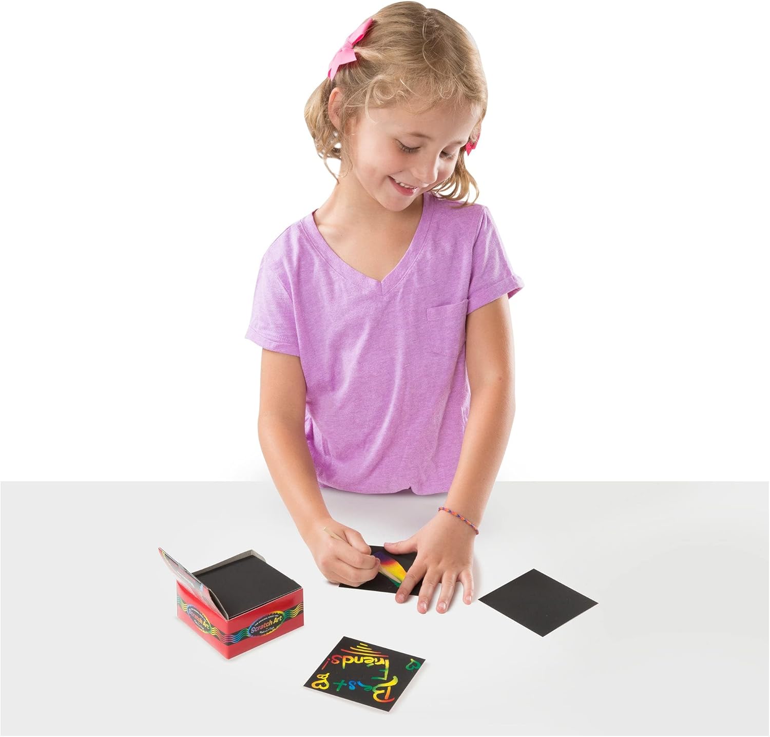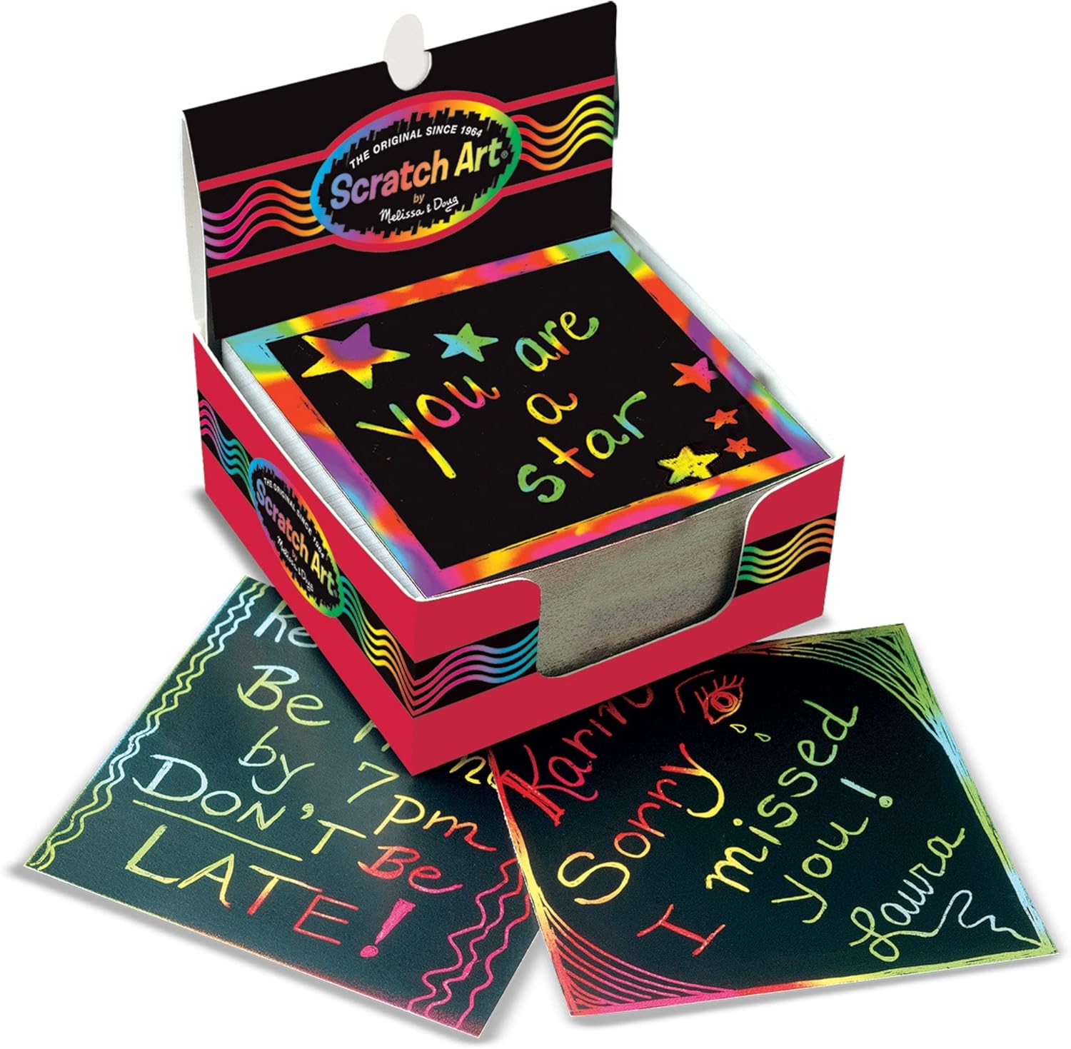 Add a splash of color and creativity to your notes and messages with the Melissa And Doug Rainbow Mini Scratch Art Notes! This delightful box contains 125 mini scratch art notes, each featuring a vibrant rainbow background hidden beneath a black coating. Simply use the included wooden stylus to scratch designs, doodles, or messages onto the surface, revealing the brilliant colors underneath. These mini notes are perfect for quick hellos, thank-you notes, lunchbox surprises, or just for a fun creative outlet. It's a simple yet magical way to add a personal and colorful touch to your communication.