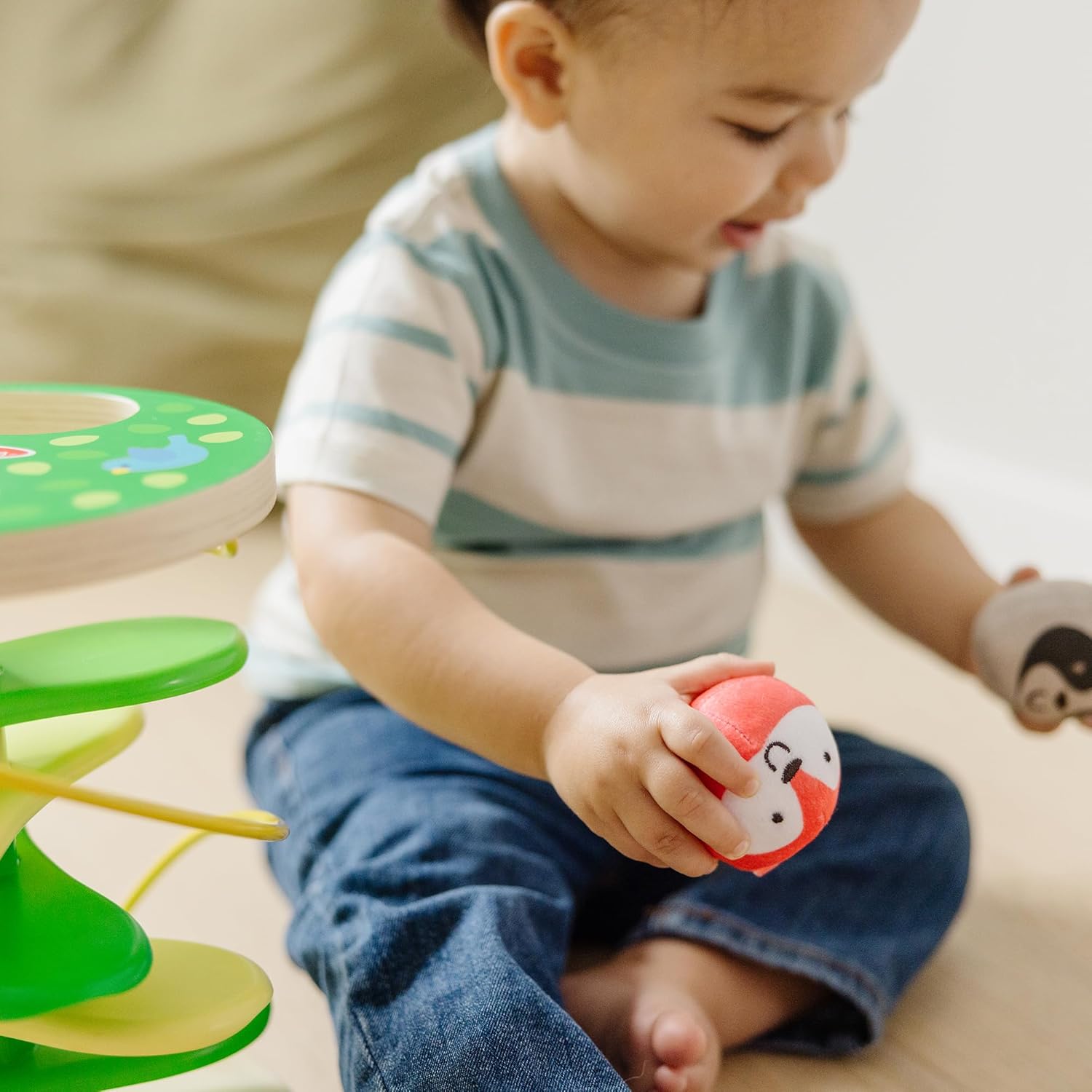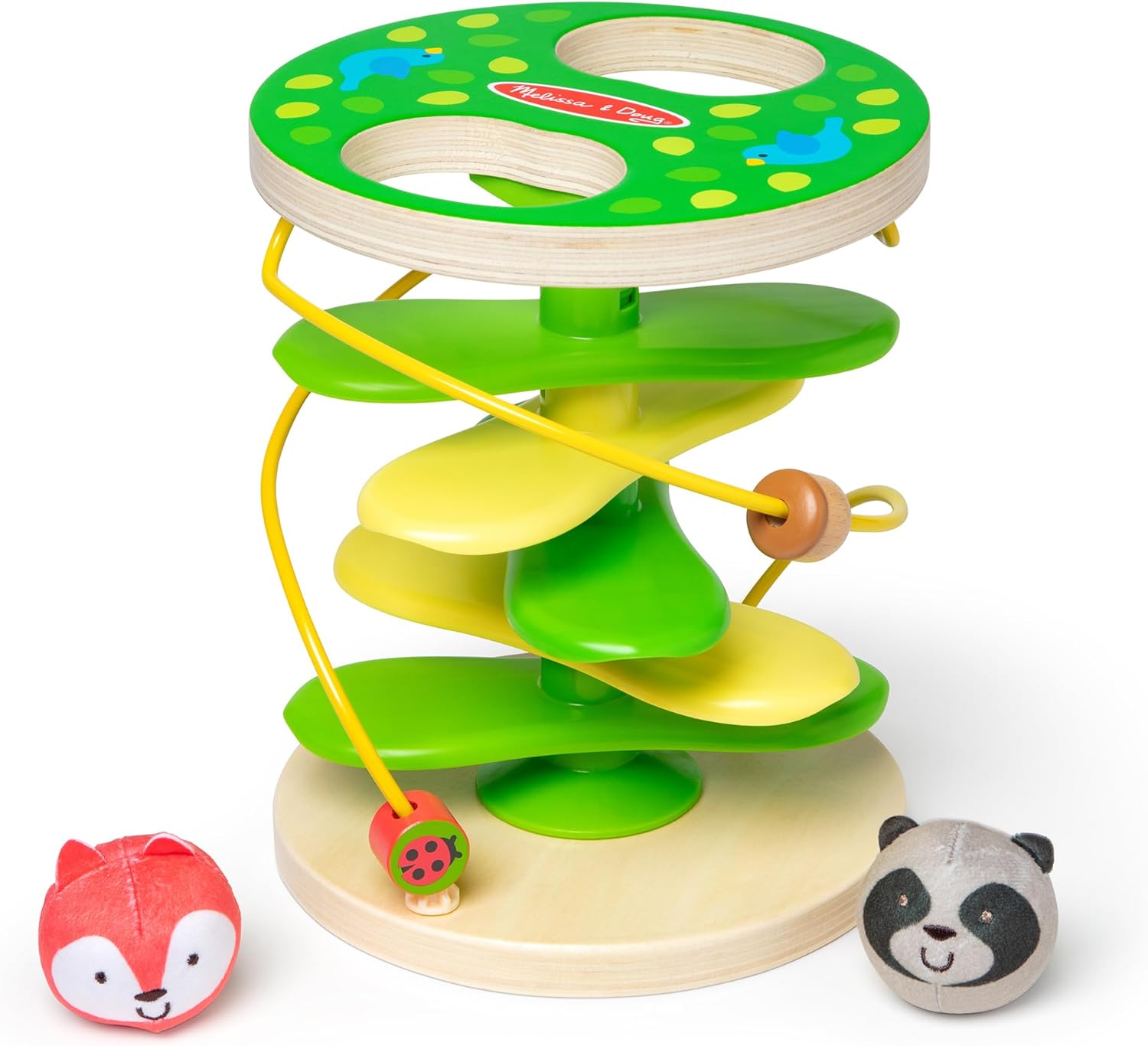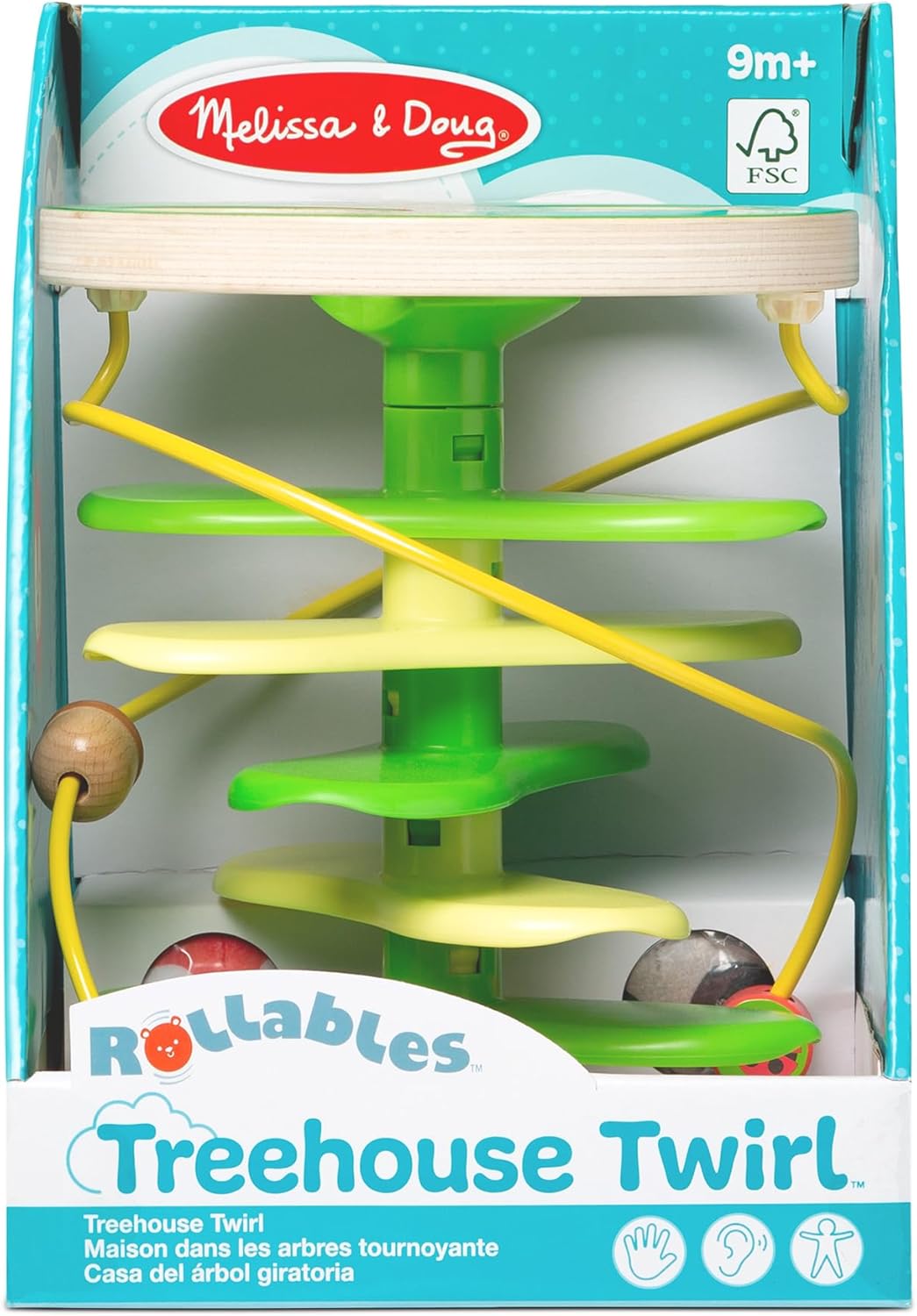 Watch the fun tumble and twirl with the Melissa & Doug Rollables Treehouse Twirl! This engaging wooden play set features a colorful, multi-level treehouse with a winding slide and a spinning leaf at the bottom. It comes with three adorable Rollables characters – a fox, a bear, and an owl – that are soft, easy to grasp, and designed to tumble and roll down the treehouse slide. Children can drop the Rollables from the top, watching them zoom and spin through the forest-inspired course, fostering fine motor skills, hand-eye coordination, and an understanding of cause and effect.