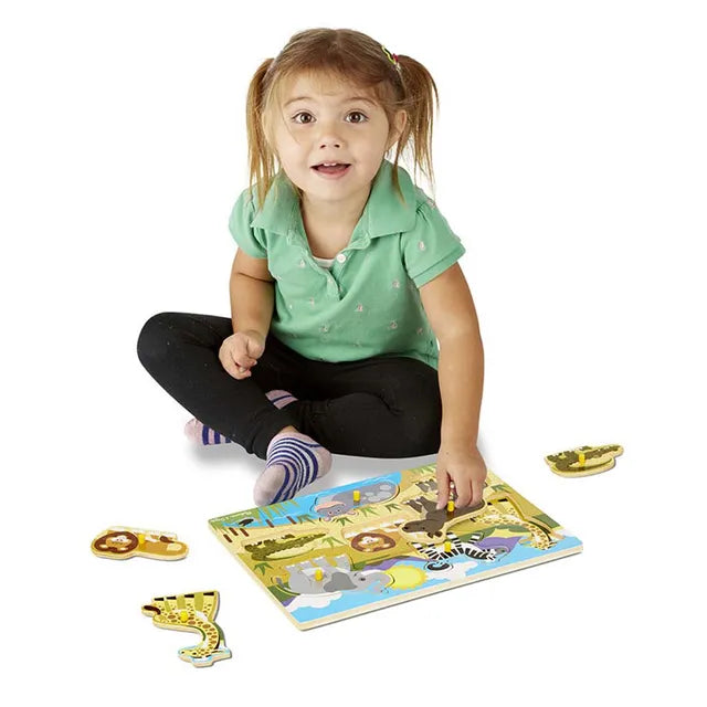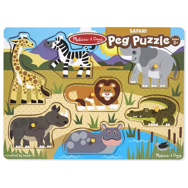 - Eight brightly colored wooden safari animal pieces with easy-to-grasp pegs.