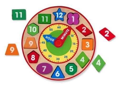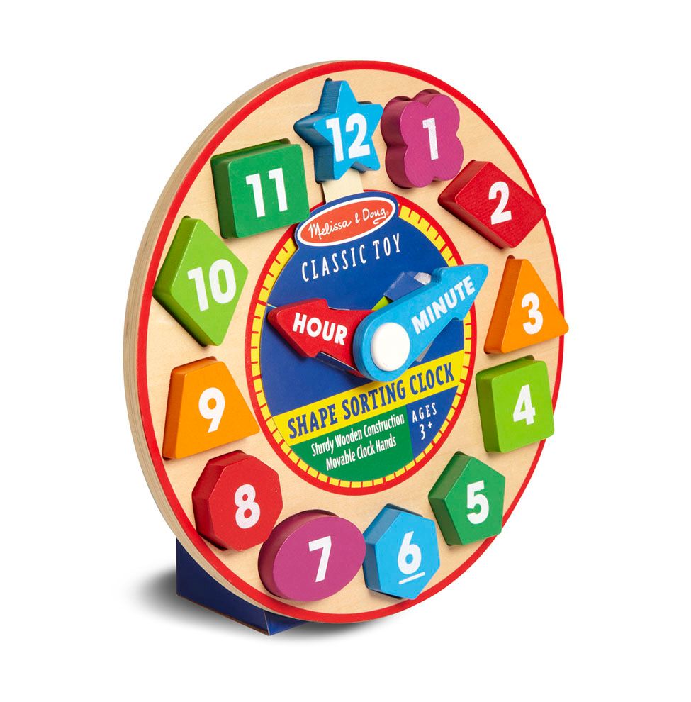 - Sturdy wooden clock with 12 removable shape-sorting number pieces.