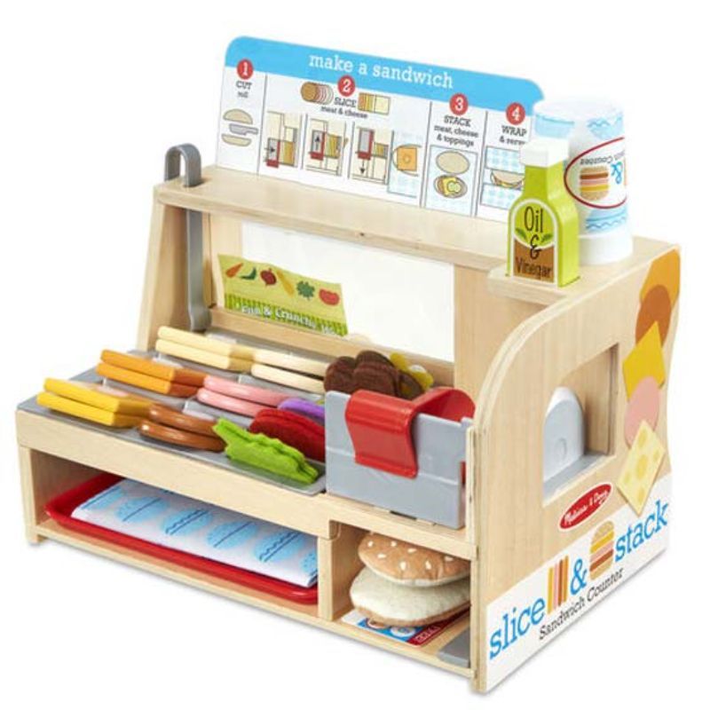 - Interactive Counter: The sturdy wooden deli counter features a built-in slicer for the wooden play food, a menu board, and sandwich prep instructions.