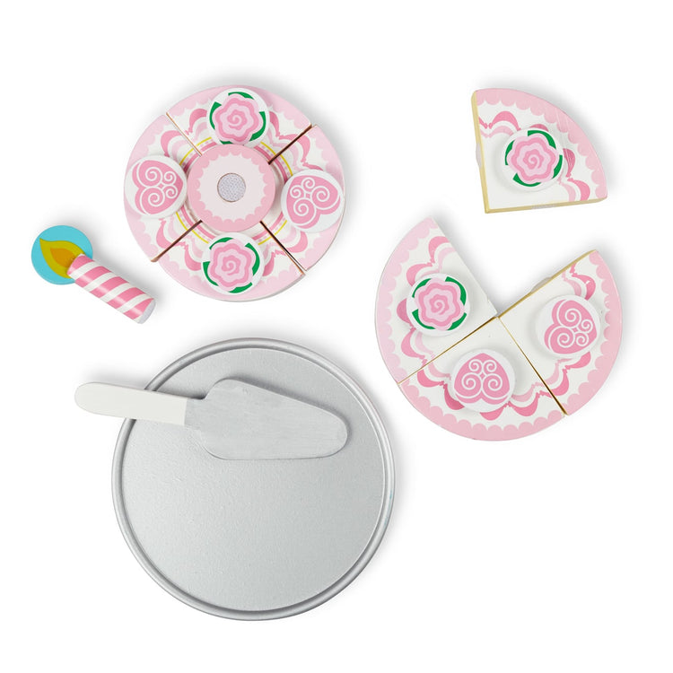 - 45-piece play food set for decorating and serving a pretend triple-layer party cake