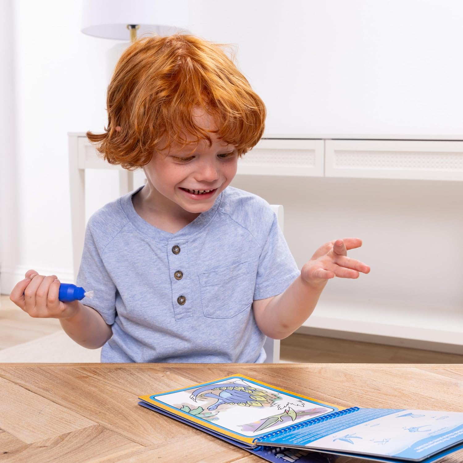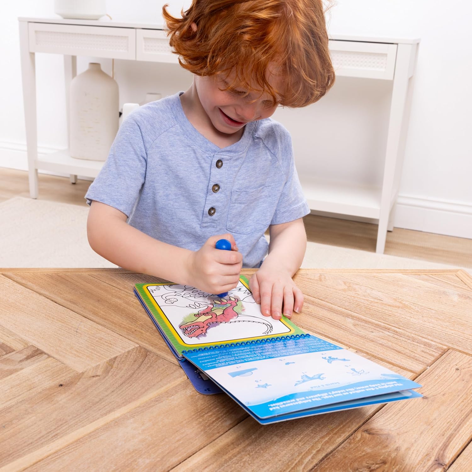 - Includes 4 spiral-bound dinosaur-themed coloring boards and refillable water pen.