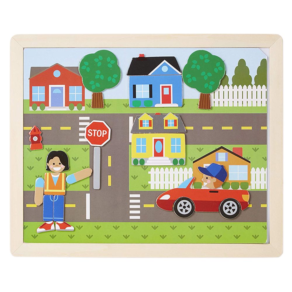 This engaging wooden magnetic matching game features 12 pairs of colorful picture magnets (24 pieces total) that children can match to corresponding images on the sturdy wooden game board. It's designed to help children develop visual discrimination skills, memory, and fine motor skills as they pick up and place the magnetic pieces. The set encourages problem-solving and cognitive development in a fun and interactive way.