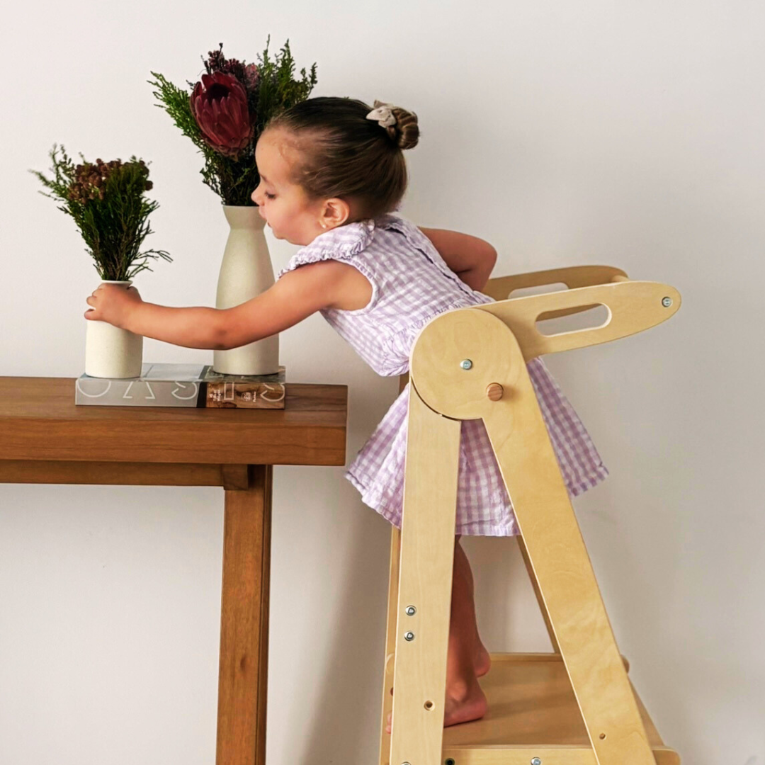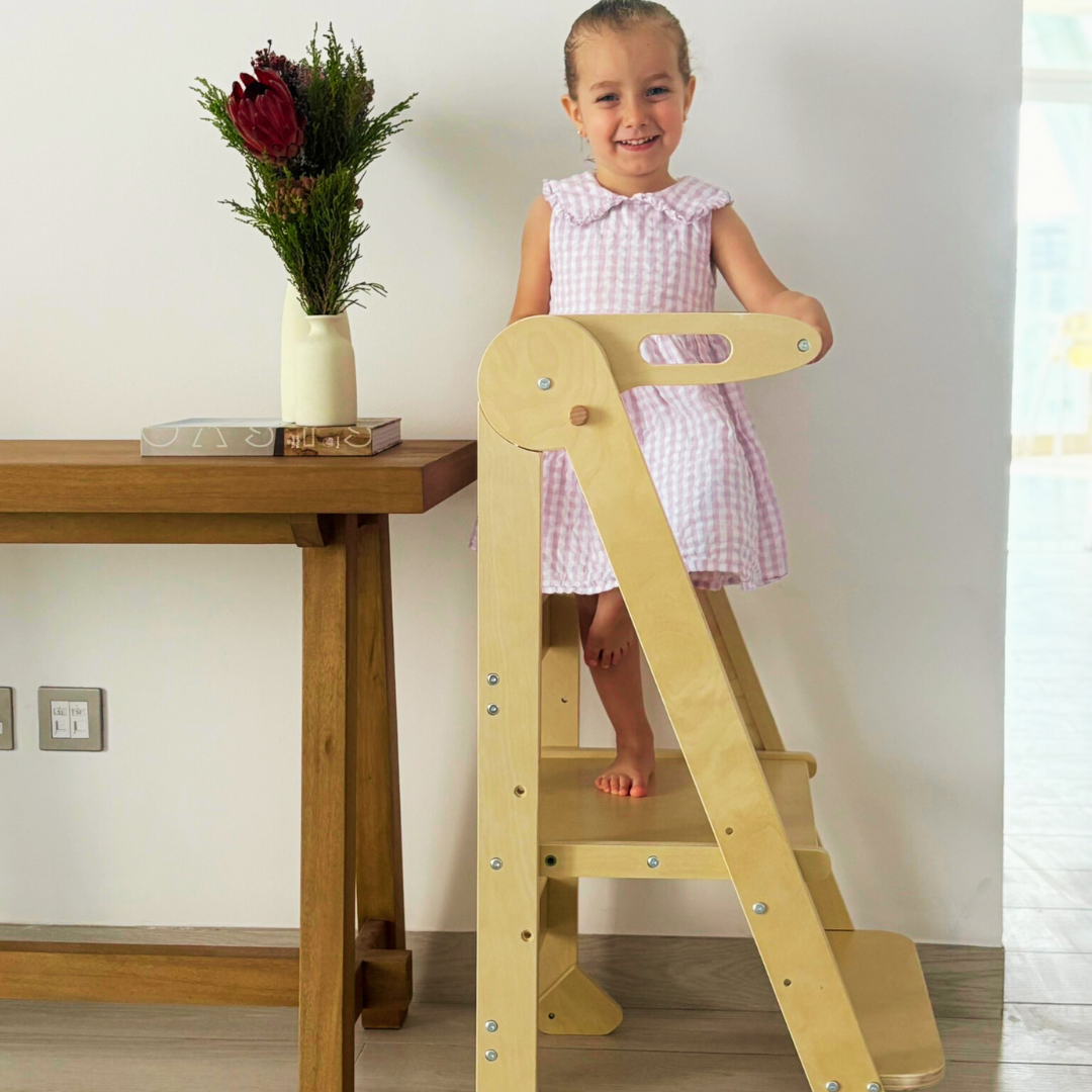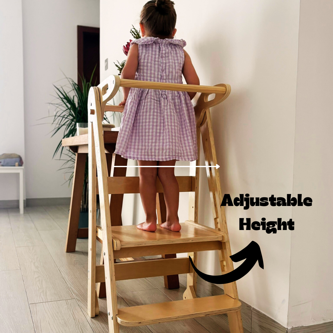 Kids loves helping momma and daddy, pretending to be a grown-up. Especially during those family bake-off days, we love getting our hands dirty together, all covered in flour and sugar, making a thousand memories together. Sounds like something you wanna cherish with your family too? Say no more. Miamamma brings the new Toddler Tower in Natural Wood, for your little one's big steps. Let them climb the new heights of learning and explore the chef in them. Not only our Toddler Tower is adjustable in height, it is foldable and easy to store. We designed it especially keeping in view the needs of both parents and the little ones. It is suitable for ages 1 to 4 and is made of sustainable plywood. What are you waiting for? Let's get those supplies and start making memories of a lifetime. With Miamamma, your adventure begins at home.
