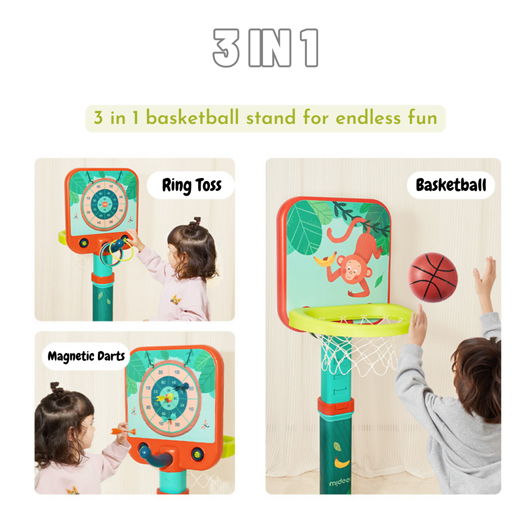 The Mideer 3 in 1 Basketball Hoop is the perfect addition to any child's playtime. This versatile toy is easy to assemble and provides endless hours of fun with three different games in one. Children can enjoy shooting hoops, playing ring toss, and even magnetic darts on its smooth surface. The stabilizer tank is capable of holding up to 7 liters of water, ensuring stability during playtime. The basketball hoop is also adjustable in height, making it suitable for children aged 3-12 years old. Whether your child is an aspiring basketball player or just loves to play games, the Mideer 3 in 1 Basketball Hoop is sure to provide hours of entertainment and endless fun.