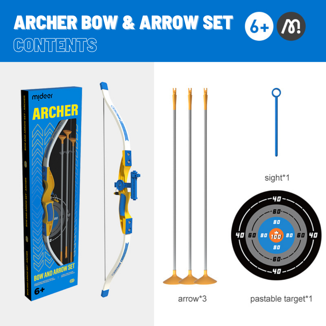 The Mideer Archery - Bow & Arrow Set is a fantastic way to introduce children to the exciting sport of archery. This set includes everything needed to get started, including a bow, three arrows with suction heads, a target, arrow rest, bow sight, and comfortable grip. The bow is made of high-quality materials and features a comfortable grip that is perfect for small hands. The bow sight allows for improved accuracy, making it easier for children to hit their targets. , , The arrow rest ensures that the arrows are held securely in place, reducing the chance of misfires. The set also comes with three arrows, each with a suction head, making it safe to use both indoors and outdoors. The included target provides a fun way for children to practice their aim and improve their archery skills.