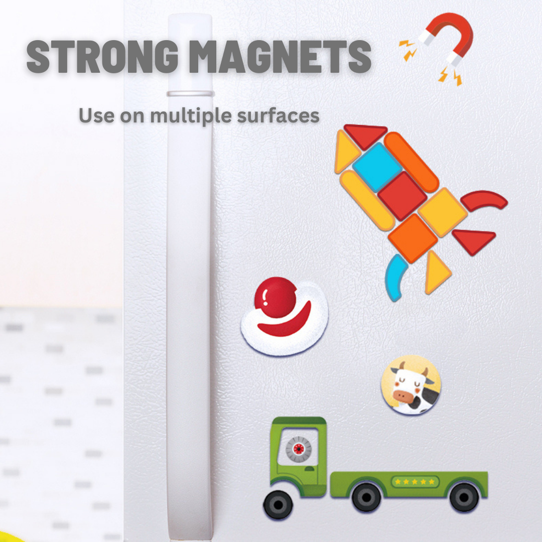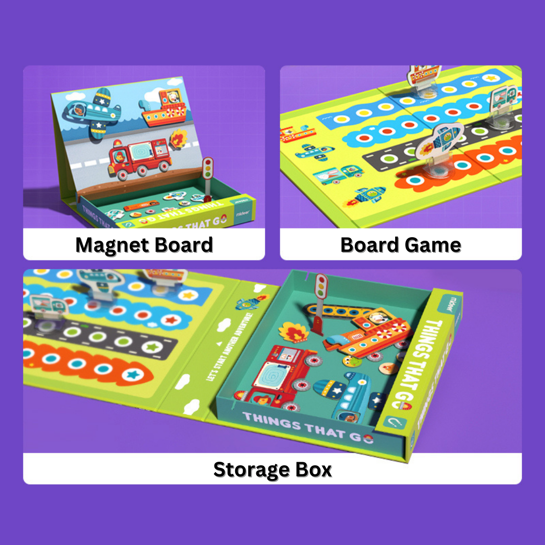Perfect for travel and easy to bring along anywhere. Follow the cards and create one of the 10 different characters or mix and match to develop your own persona. 50 different clothes magnets present your child with so many options. A wonderful magnetically closing box is included to store all the 50 magnets and cards on the shelf. The game encourages creative play and helps develop problem-solving, matching, and fine motor skills.