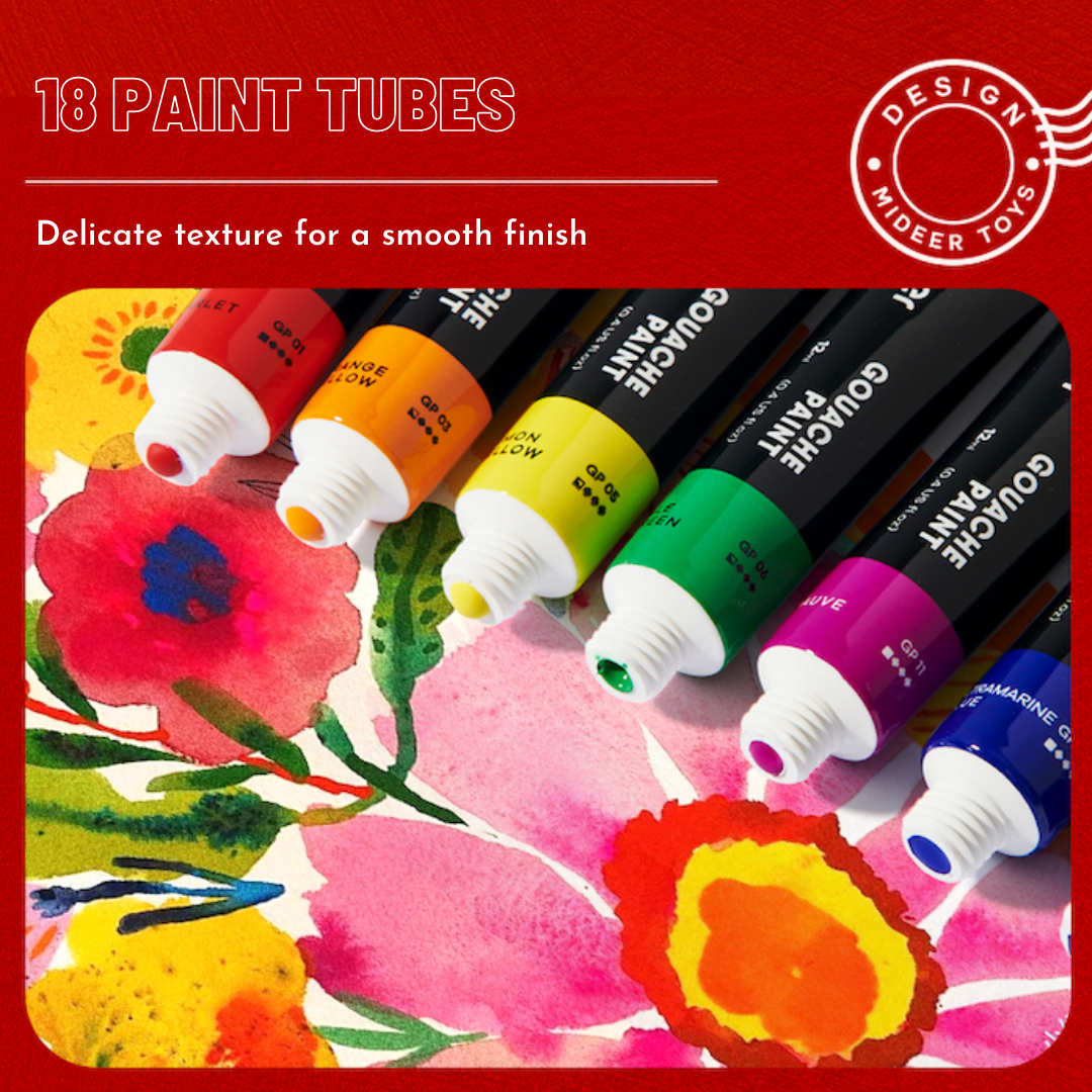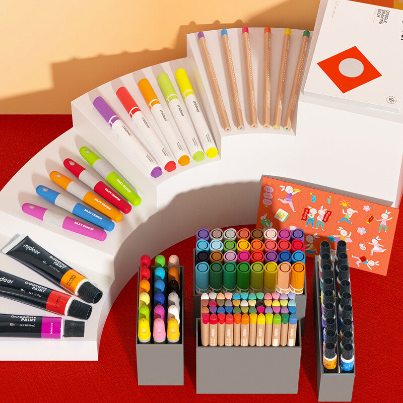 - Includes a doodle book, 32 washable markers, 18 rotary crayons, 18 gouache paints, and 48 colouring pencils