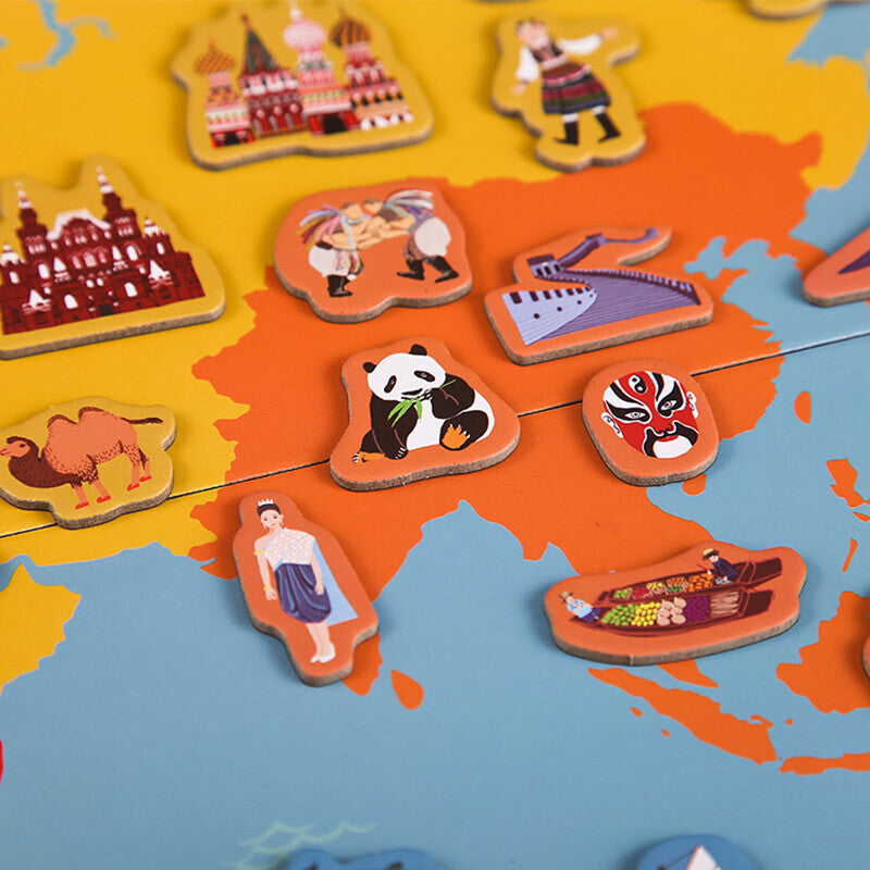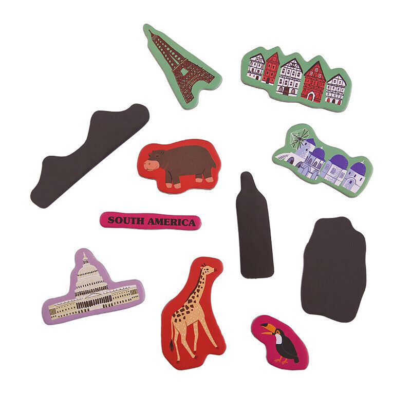 Explore the world, its wildlife, and landmarks with your child! The Mideer Hello World Magnetic Puzzle has a beautifully illustrated world map where you can stick the designated magnetic puzzle pieces for each continent. The world is at your fingertips! Visit the famous monuments of the world, from the Great Wall of China to the Statue of Liberty. Go on an African safari or sail across the great blue sea! There's always a new place to take your imagination!