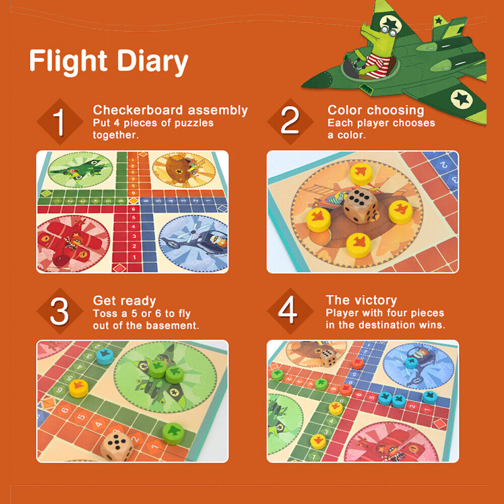 Contains 4 large double-sided board puzzles, 2 wooden dice, 20 wooden chess and instructions.