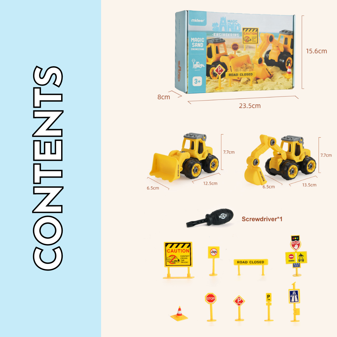 This Magical Sand Engineering Kit is your perfect companion at the beach. Put up the construction signs and begin digging. This kit works best with the Mideer Magical Sand, designed for indoor and outdoor fun.