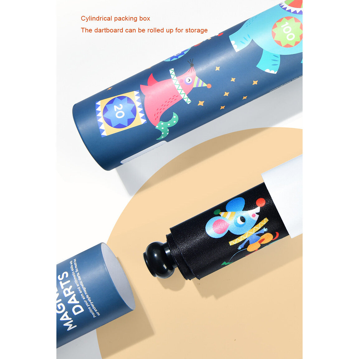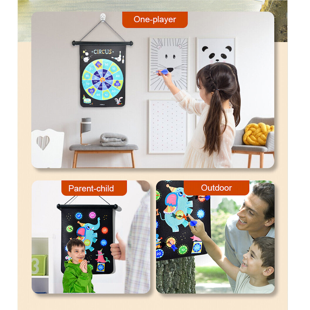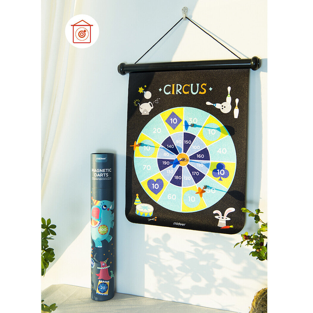 Mideer's double-sided dartboard is suitable for the whole family! The classic front side will require concentration to score and the fun backside will boost your little one's confidence. Its cylindrical box packaging makes it portable and easy to store!