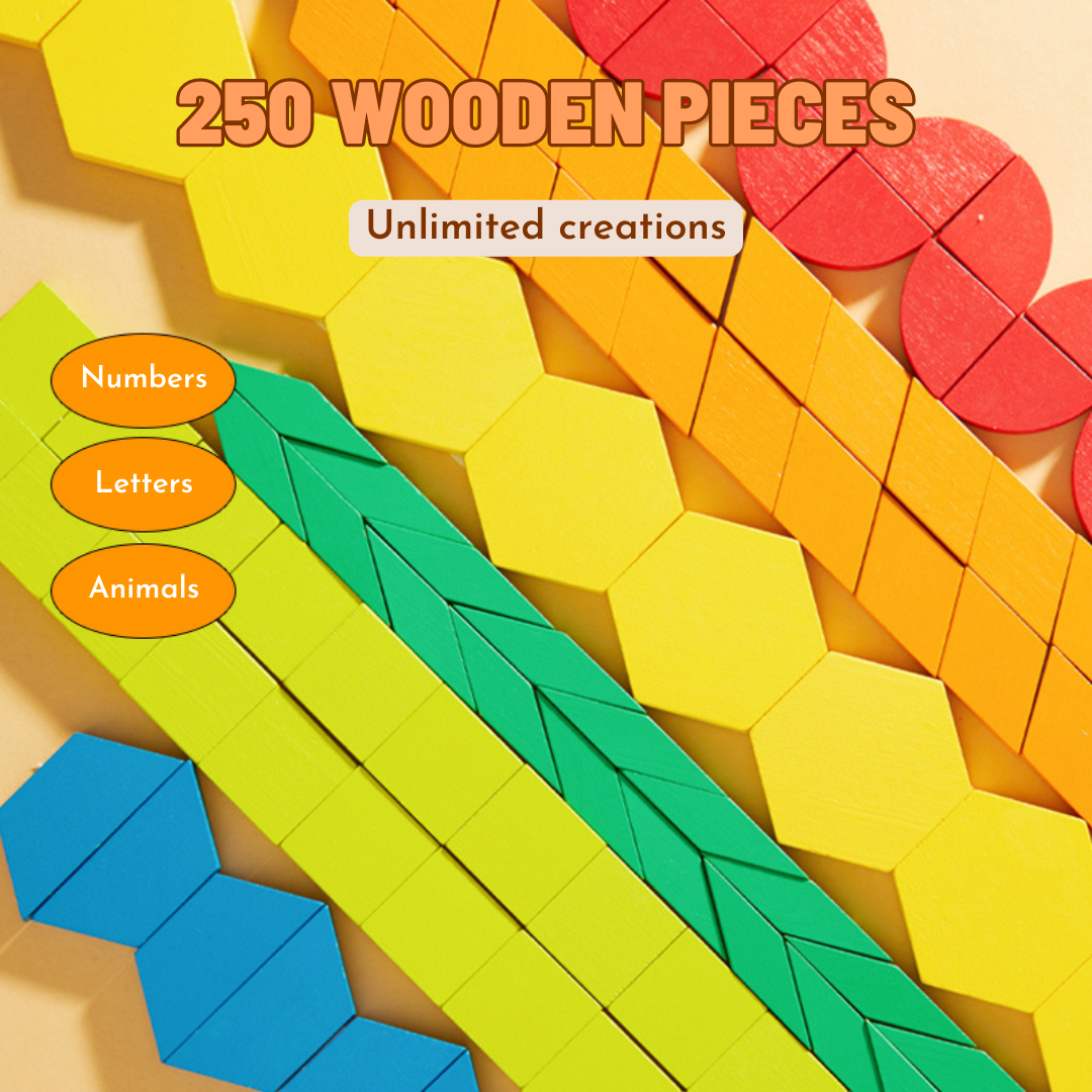 - The set includes 250 wooden blocks in different shapes, sizes, and colours