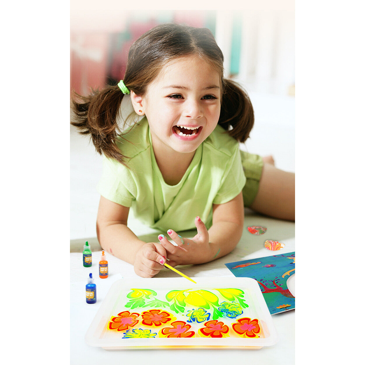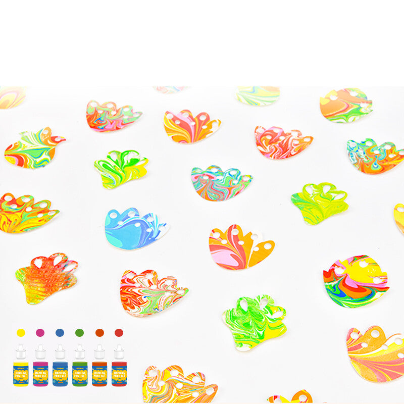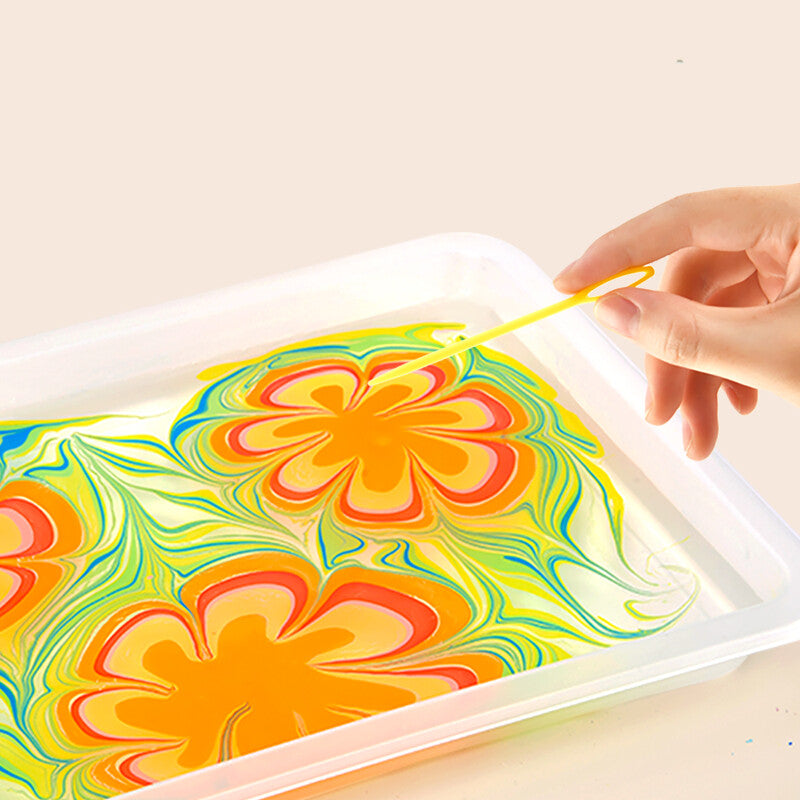 The Mideer Marbling Paint Kit offers a different way of painting, paints floating in the water. With easy-to-follow instructions, this kit allows kids to use a marbling stylus or comb and create any patterns they like. It contains everything needed: 12 sheets of paper (4 designs), 6 pigments, 4 themed cards, 1 tray, 1 instruction manual, and other materials, including marbling comb, marbling stylus, measuring spoon, carrageenan powder, dropper. This magical and wonderful marbling painting kit enables your child's imagination to bloom on water like a dye and stimulates creativity through this incredible marbling painting.