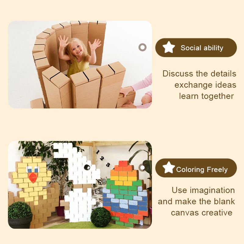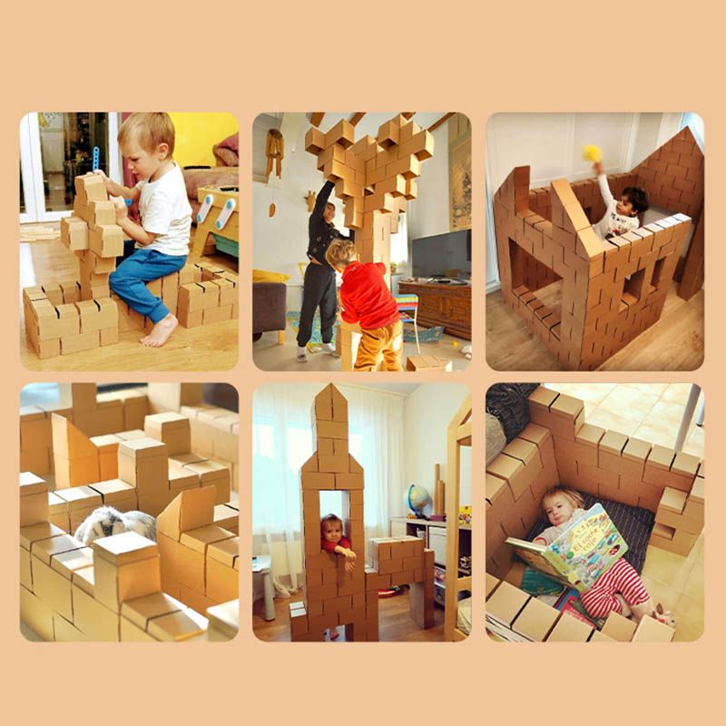 Our jumbo cardboard blocks utilize a SMART INTERLOCKING SYSTEM that features a nest-like mechanism to increase stability. As a result, you don’t have to worry about accidentally ruining your kid’s creation. Rest assured that your giant towers and robots will not topple over even if your kid bumps into them!