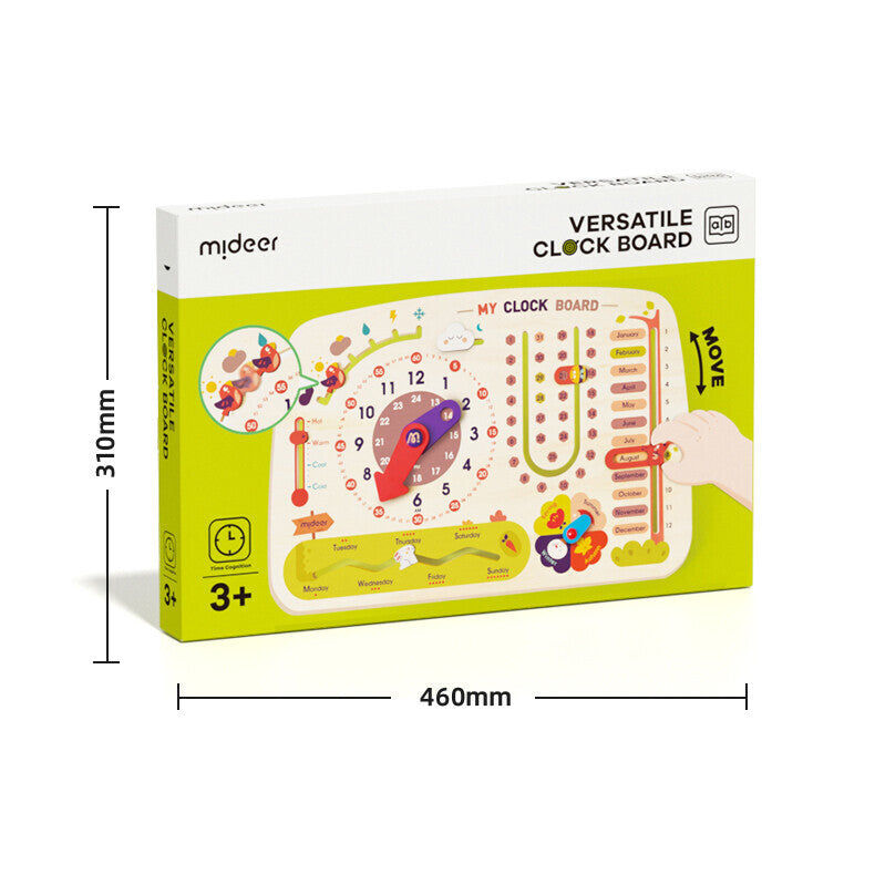 - The board features a movable clock with hands that can be adjusted to teach children how to tell time and develop their time management skills.