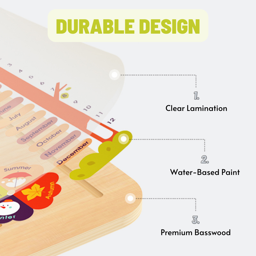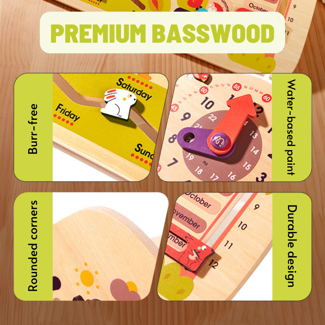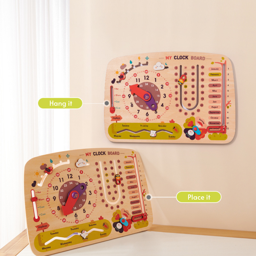 - The kids' wooden board is a fun and interactive way for young children to learn about important concepts such as time, weather, and dates.
