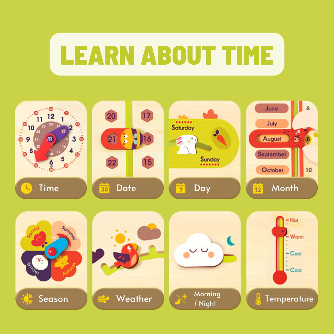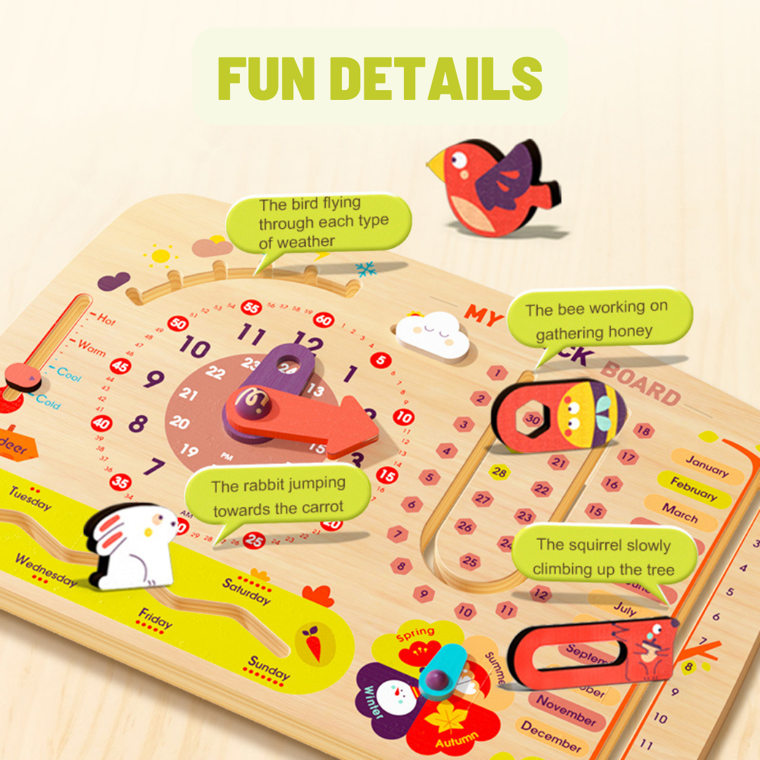 - The calendar section of the board allows children to learn about different days of the week, months, and dates, helping them to understand the passage of time.