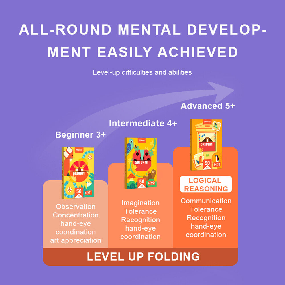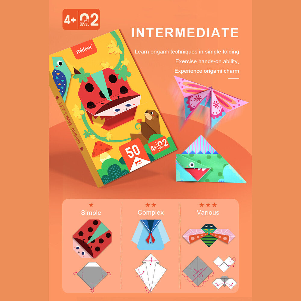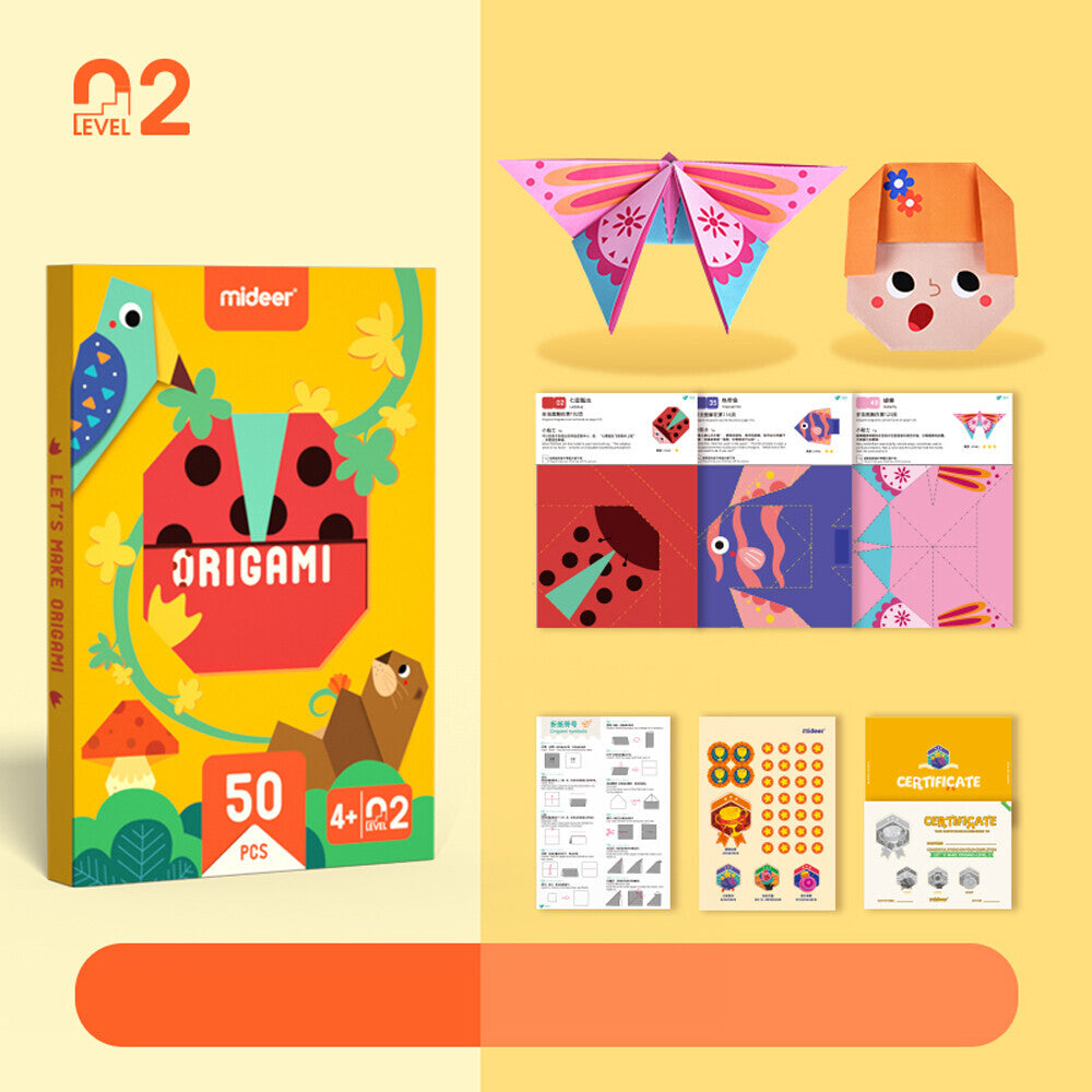 Mideer Let's Origami Kit series is a set of origami kits with three levels of difficulty. It helps kids be creative and imagine shapes better. Each level has different origami projects that are just right for kids of different ages. It's a fun way for kids to learn and enjoy making things out of paper! The Mideer Let's Origami Kit series not only provides an enjoyable way for children to engage in artistic expression but also fosters valuable cognitive and motor skills essential for their growth and development.