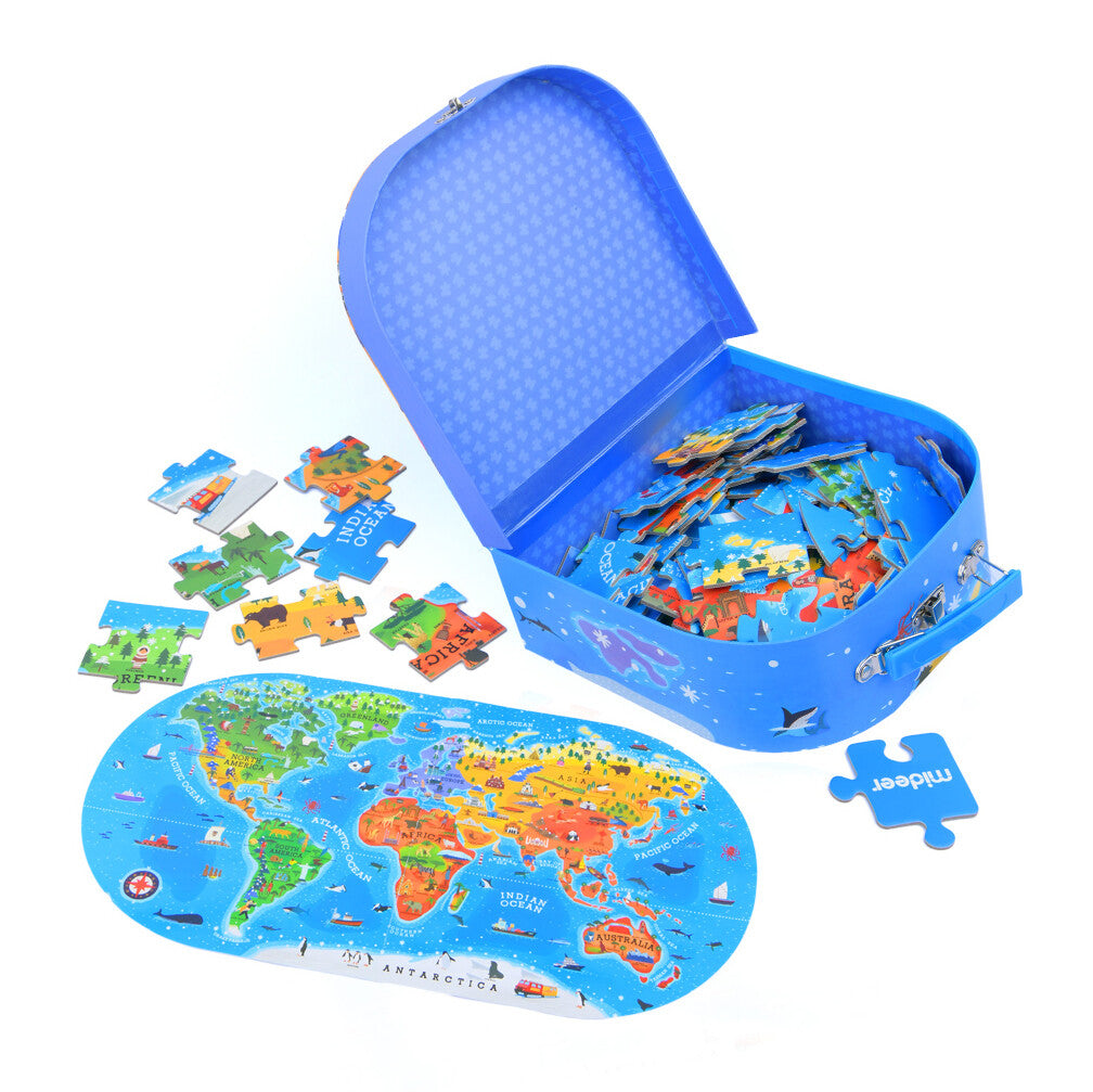 The Mideer gift box puzzles come in a handy carry handle case for puzzles on the go. The jigsaw puzzle contains 104 2.5mm extra thick jigsaw puzzle pieces made using 3 layers of card with a soft rounded edge vinyl image layer and smooth backing, offering a tactile feel for little fingers. The puzzle depicts an intricate and colorful illustrated scene, with a handy foldout image sheet to follow while piecing the puzzle together.