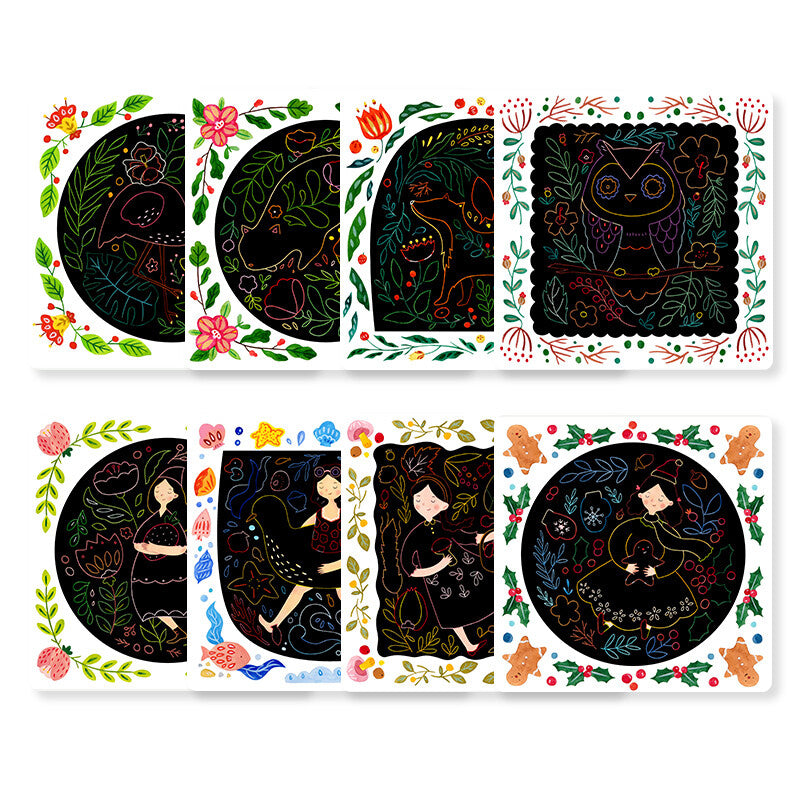 Create beautiful masterpieces by using the included wooden stylus to rub the surface of cards and reveal amazing colours and scenes. , What's Included: Black Natural Coating Scratch Cards x 8, Bamboo Pen X 1, Drawing Card Size: 20 cm x 20 cm ,